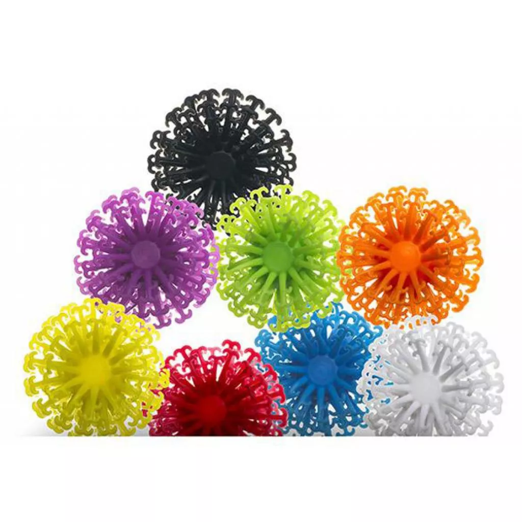Легкие и небольшие шарики (диаметром около 1.5 см) легко прилипают друг к другу, создавая фигурки. Яркие цветные шарики нужно просто приложить друг к другу и расположенные на их концах крючки сами сцепят детали между собой.