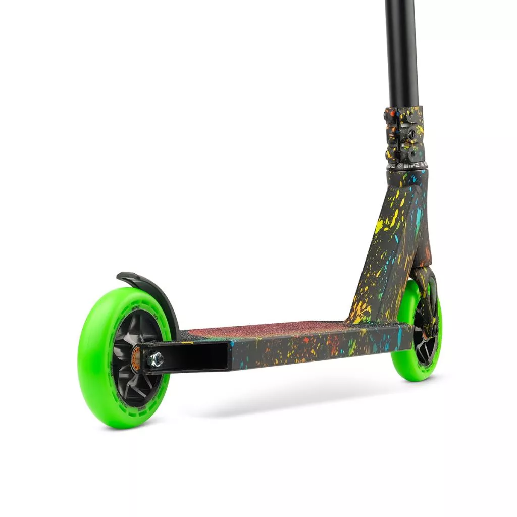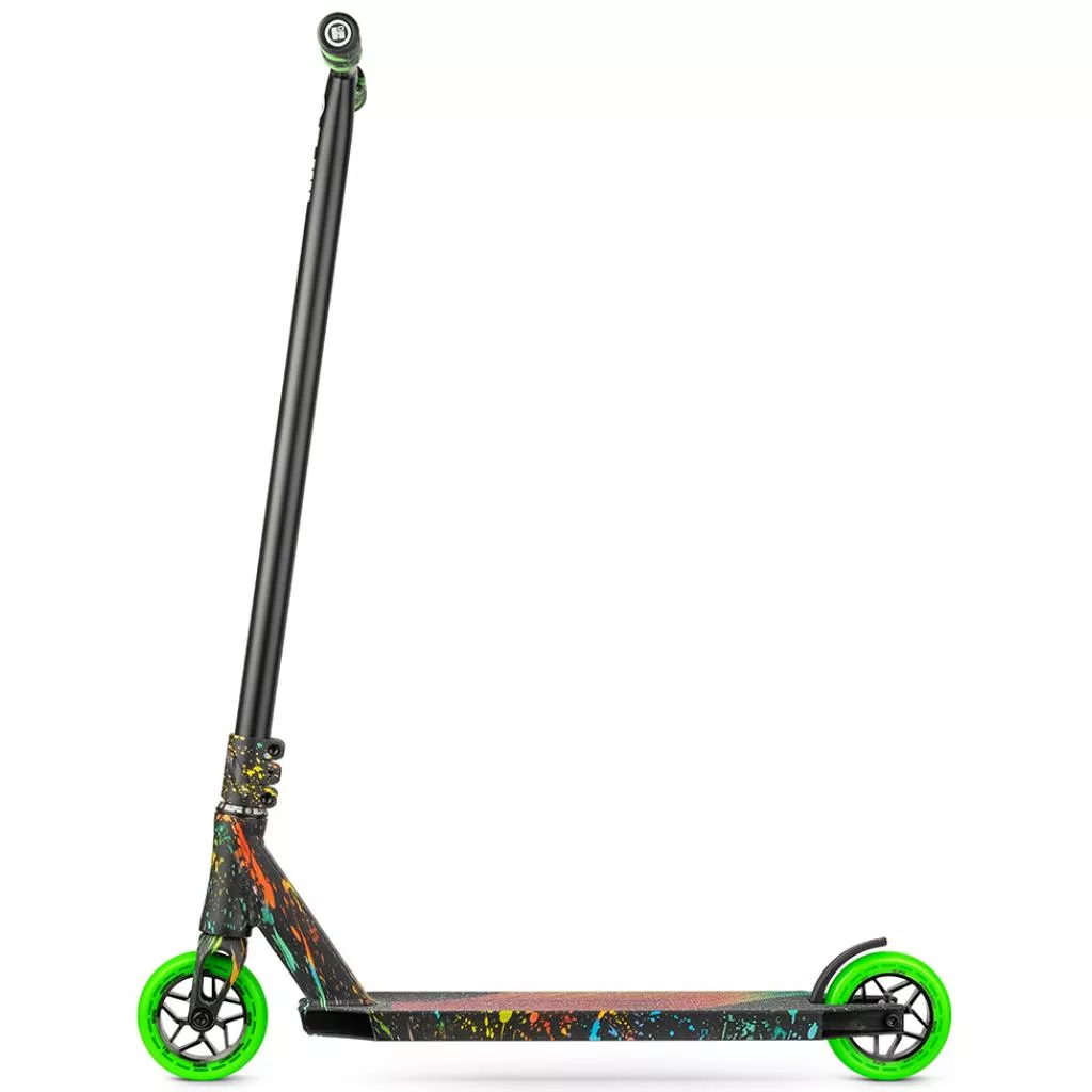 Основной особенностью модели являются инновационные алюминиевые спицевые колеса диаметром 115 и шириной 26 мм, не имеющие аналогов на рынке. Такие колеса обеспечивают золотую середину между хорошим накатом и устойчивостью на приземлении, а также повышают контроль при скольжении по препятствиям. Амортизационный профиль во внешней части дает возможность гасить удары во время исполнения трюков, а жесткость в 88А делает их оптимальными как для паркового, так и для городского покрытия.