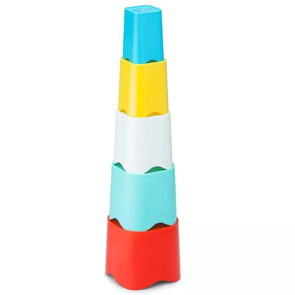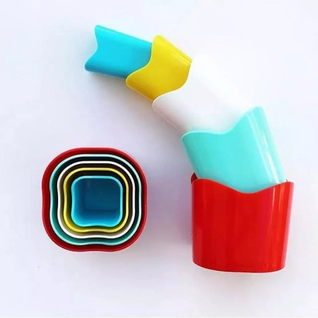 Эта пирамидка не совсем обычная: она состоит из пяти "стаканчиков", из которых можно построить башню (принцип «пирамидки» - от большего к меньшему), либо вложить один стаканчик в другой (принцип «матрешки» - меньший в больший). Такие стаканчики пригодятся как для игр в воде, так и в качестве пасочек для игр в песочнице. В собранном виде занимает мало места.