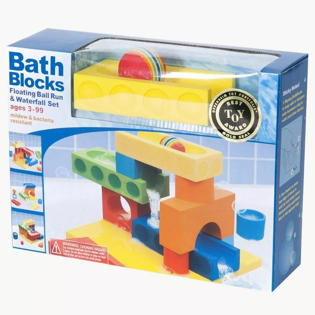 Необычный конструктор для игр в ванной от Just Think Toys. В набор входят разнообразные пенообразные мягкие строительные блоки и мячик. Из этих блоков можно построить «трассы-водопады», по которым мяч будет скатываться, а под воздействием движения воды вся конструкция также будет перемещаться (за счет плавучести).