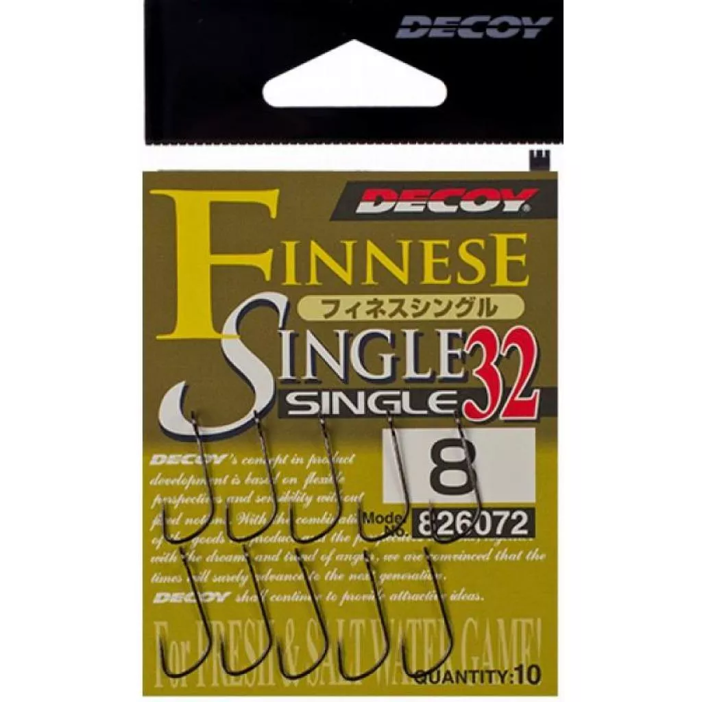 Крючок Decoy Single 32 предназначен для оснащен и укомплектования силиконовых приманок при ловле хищной рыбы. Что примечательно, форма крючка была разработана в сотрудничестве с отечественными рыболовами-спортсменами, которые считаются одними из лучших спиннингистов в мире. Правильно подобранная толщина проволоки и особый изгиб, дают возможность приманке лучше удерживаться на крючке и рыбе существенно сложнее стащить её. Также, такая форма способна выдержать большие нагрузки и меньше подвержена разгибанию. Single 32 имеет увеличенное ушко для большей свободы при осуществлении проводки.