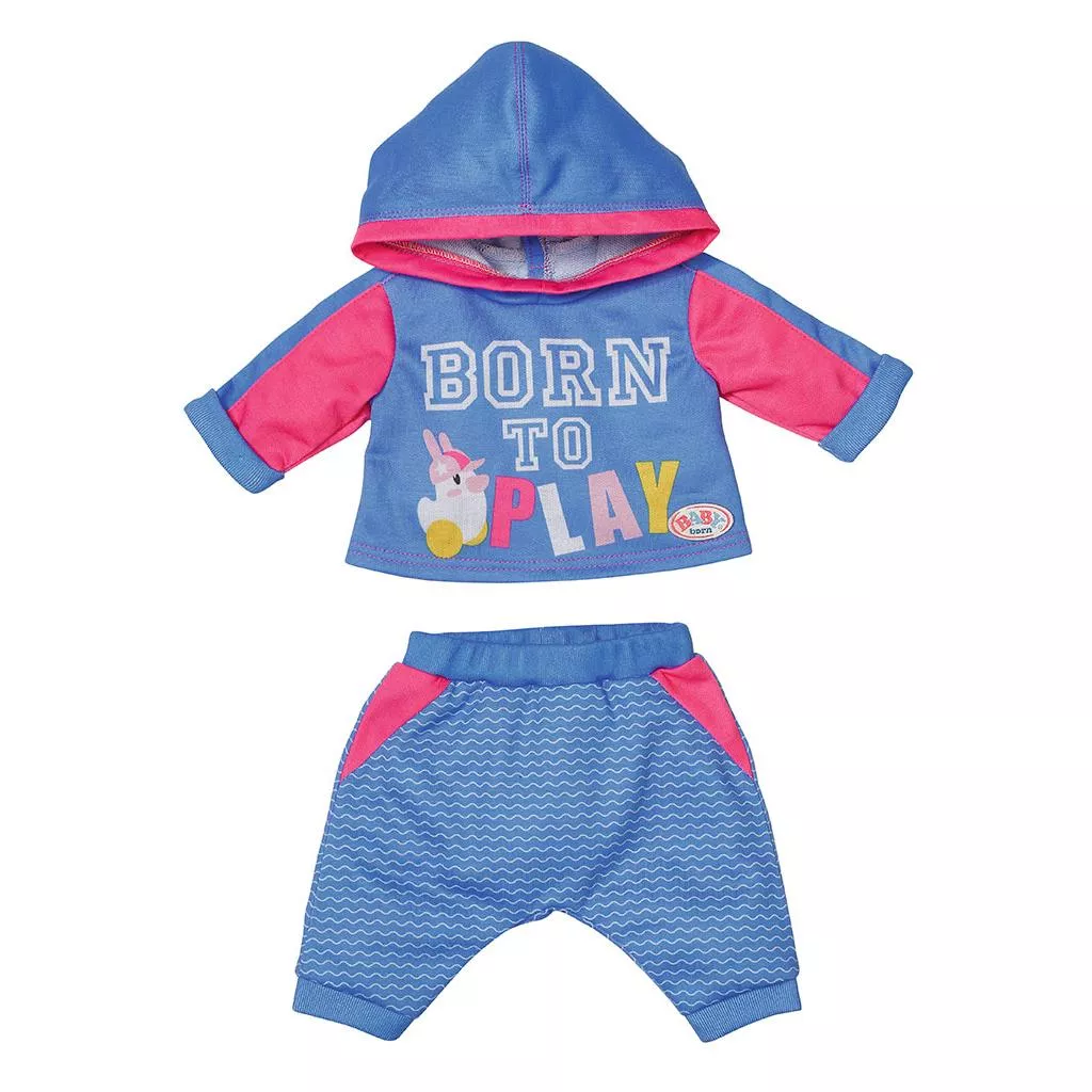Малыши BABY Вorn очень активные и очень любят играть – как дома, так и на свежем воздухе. Яркий новый синий спортивный костюм для куклы даст возможность сделать игры с ней ещё ярче и веселее! Штанишки и кофточка с капюшоном с милыми рисунками и жизнерадостными надписями добавят новых эмоций в игры с куклой.