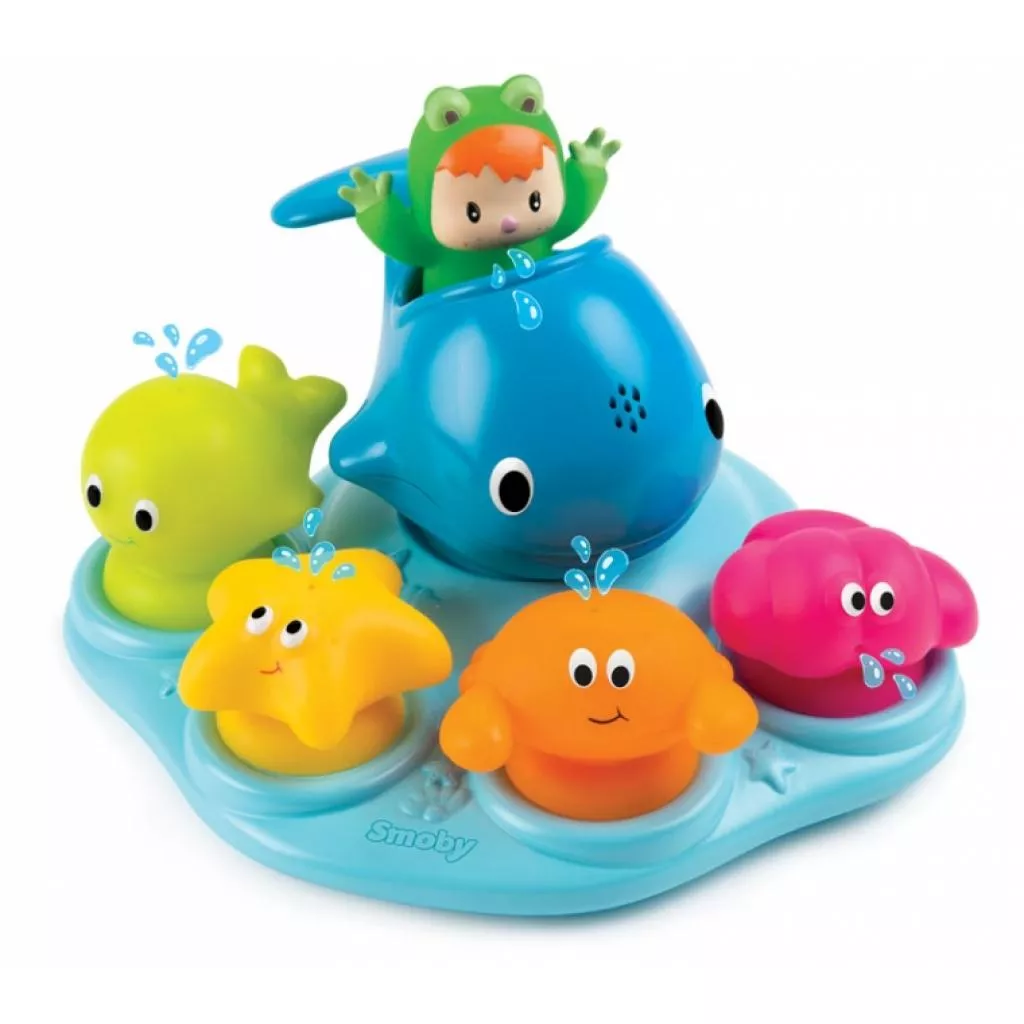 Превратить обычное купание на веселые развлечения, легко, имея набор для ванны Cotoons Веселые животные от Smoby. Набор состоит из: островка — подставки, 4-х цветных брызгалок, кита — лейки и фигурки — брызгалки Лягушонок Вабап. Каждая брызгалка имеет присоску, легко крепится к стенкам ванны и плитки. На подставке под каждую брызгалку есть место, рассадите всех по местам и запускайте остров плавать по воде. Все элементы набора приятные на ощупь и удобные для детских рук. Играя набором ребенок будет изучать формы, цвета и подводных друзей: краба, кита, ракушку и морскую звездочку.