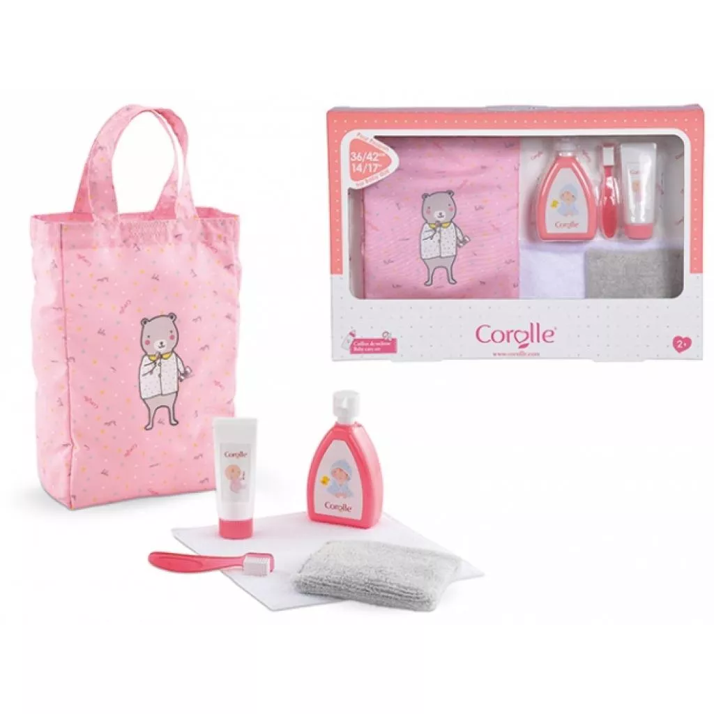 Представляем вам игровой набор Утренний уход от Corolle, который даст возможность ребенку заботиться о своем любимом пупсе и научить его чистить зубки. В набор входит 6 предметов: зубная щетка, тюбик - зубная паста, детский лосьон, губка, полотенце, и все это удобно сложить в сумочку. Сумочка изготовлена ??из качественной ткани с ровными и прочными швами, украшенная цветным рисунком медвежонка. Теперь все необходимое для ухода за любимым пупсом можно взять с собой на прогулку. Играя набором ребенок развивает мелкую моторику и учится быть заботливым. Набор рекомендован для игры с пупсом высотой 36 - 42 см.
