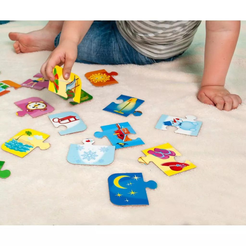 Разложите все детали перед ребёнком. С одной стороны стола положите все картинки с надписями (день, ночь, весна, лето, очень и т.д.), с другой – разместите остальные изображения. Покажите малышу картинку «ночь»: месяц улыбается, вокруг засияли яркие звёзды. Что у нас ассоциируется с ночью? Пускай малыш присоединит деталь с нужным изображением. Сложите все пазлы-парочки, повторяя названия времён года и времени суток.
