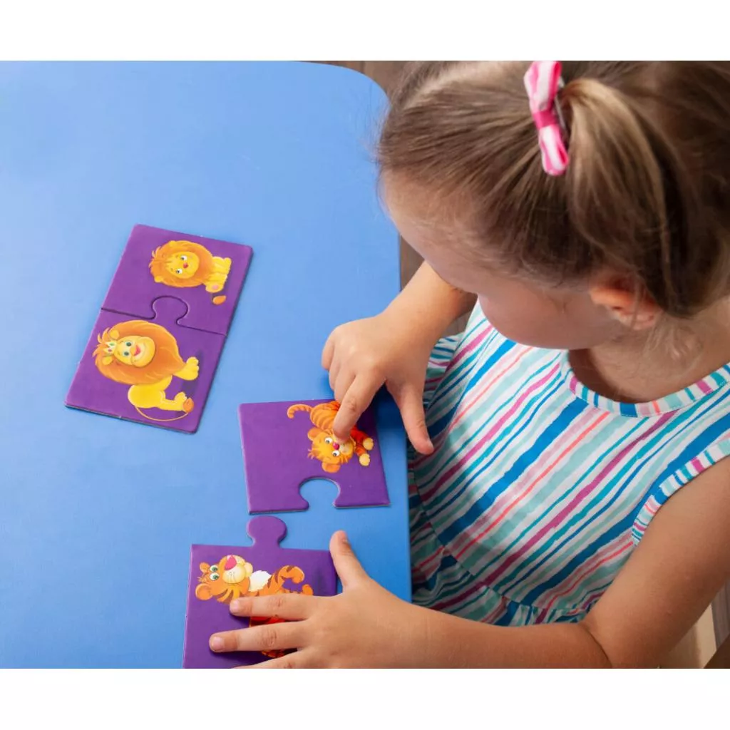 Разложите все детали перед ребенком. С одной стороны стола положите рисунки с изображениями взрослых животных, а с другой – рисунки с их детьми. Покажите, например, изображение утенка. Кто его мама? Пусть малыш присоединит деталь с соответствующим взрослым животным (то есть уткой). Готово! Сложите таким образом все пазлы-парочки, повторяя названия животных-мам и животных-малышей.