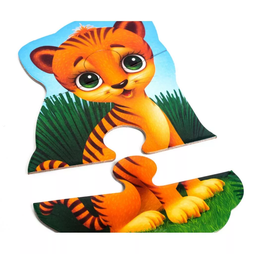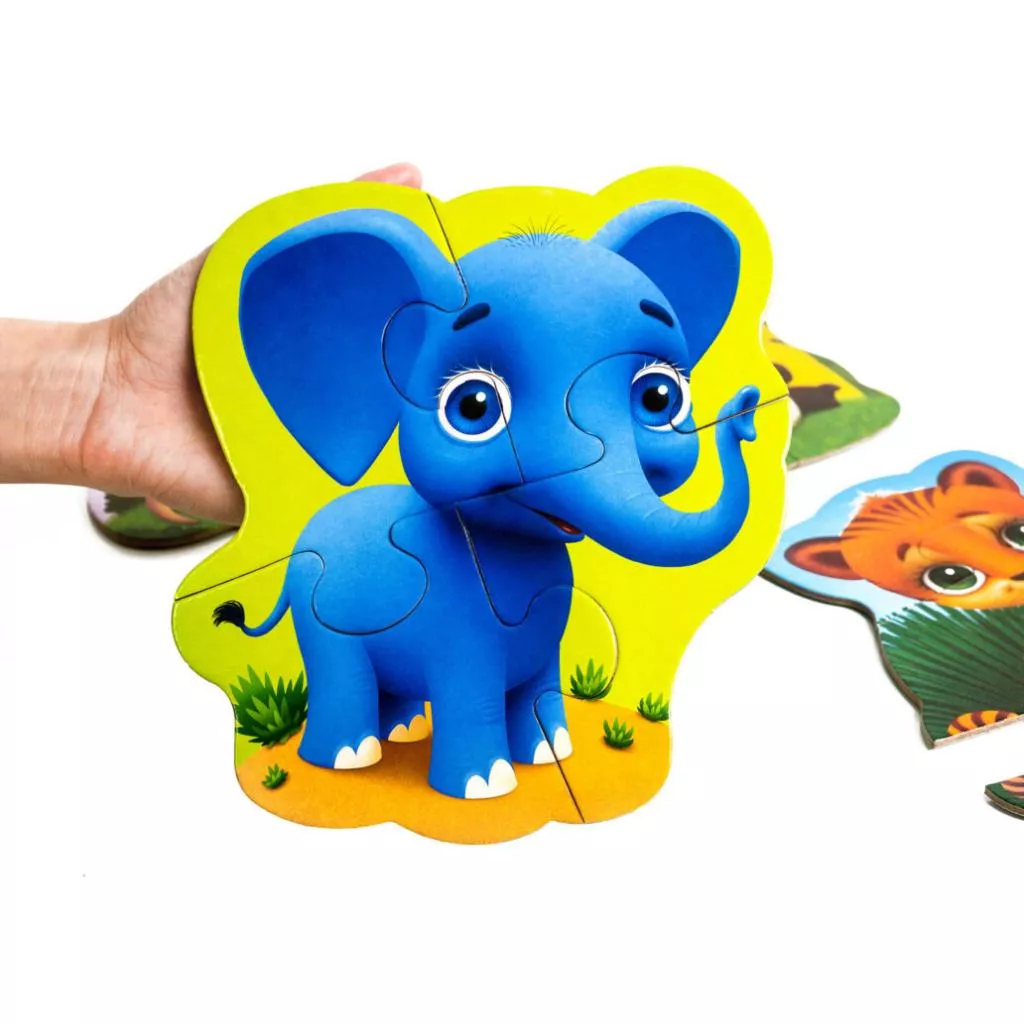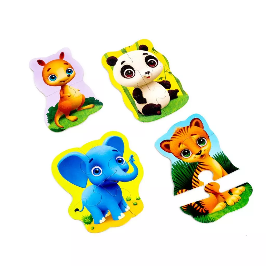 Изучайте животных зоопарка в интересной игровой форме! Объединяйте элементы пазлов между собой и составляйте яркие картинки со львенком, пандочкой, слоником и кенгуру.
