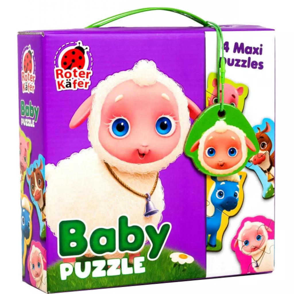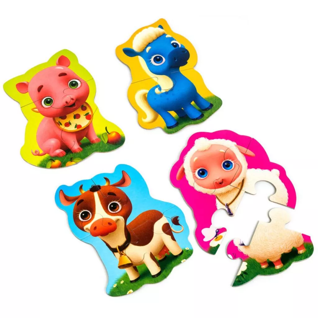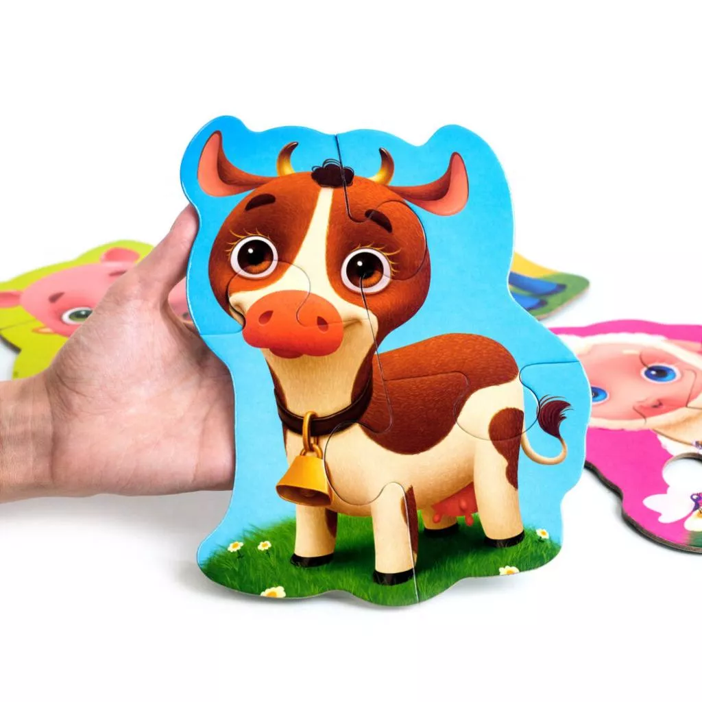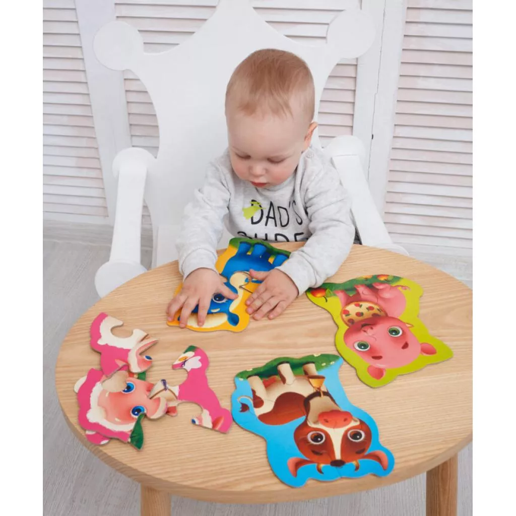 Объединяйте элементы пазлов между собой и составляйте яркие картинки с коровкой, овцой, свинкой и лошадкой. Все детали крупные и очень удобные для детской ручки. Они надежно скрепляются между собой, и изображение не распадается.