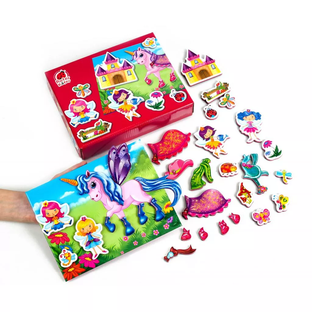 Игровой набор «Феи и единорог» содержит магнитную доску, с изображенным на ней сюжетом, и 32 тематических магнита. Прикрепляя их к доске, ребенок создаст свою неповторимую историю. Придумывайте новые события и делитесь ими друг с другом!