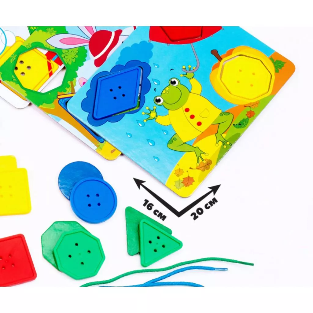 Разложите перед ребенком картонные поля и пуговицы. Пускай малыш внимательно рассмотрит их. Часть полей содержит нарисованные контуры геометрических фигур. Малыш должен найти пуговицу соответствующей формы и цвета и прикрепить её к полю с помощью шнурка. На остальных карточках есть специальные отверстия. На их место нужно вложить пуговицу соответствующей формы.