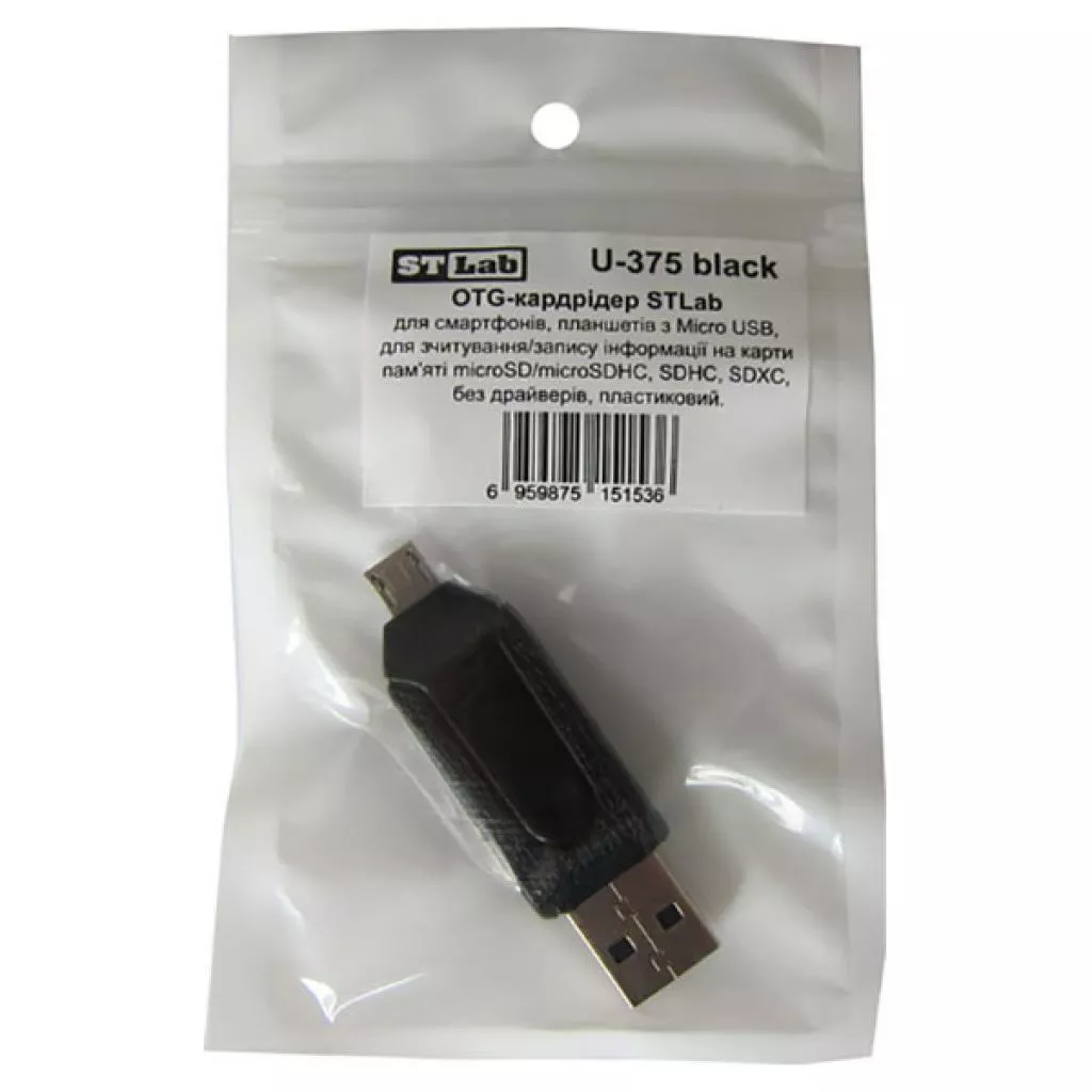 Кардридер STLab OTG U-375 для смартфонов, планшетов с функцией OTG и с разъемом microUSB, имеет 2 слота — SD и microSD. Поддерживает карты памяти microSD, SD, а также высокоскоростные карты microSDHC, SDHC, SDXC до 128 ГБ.