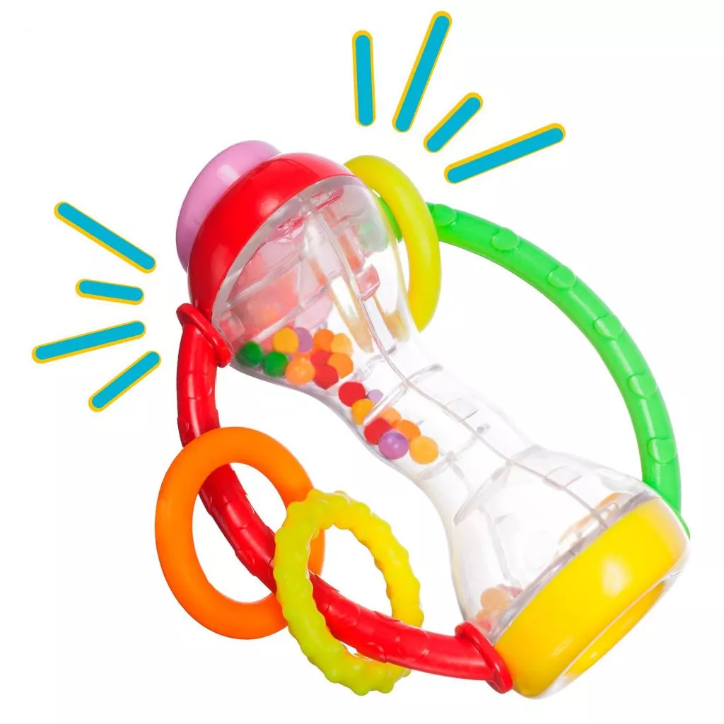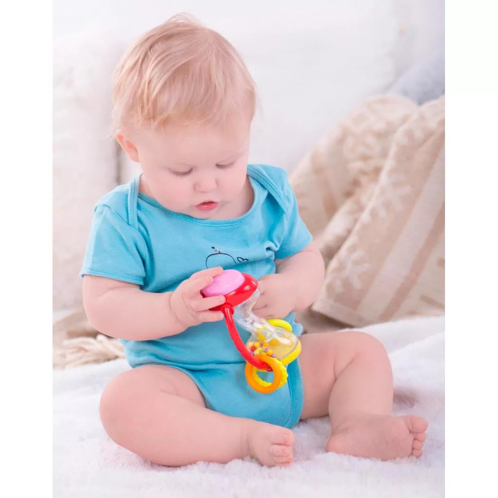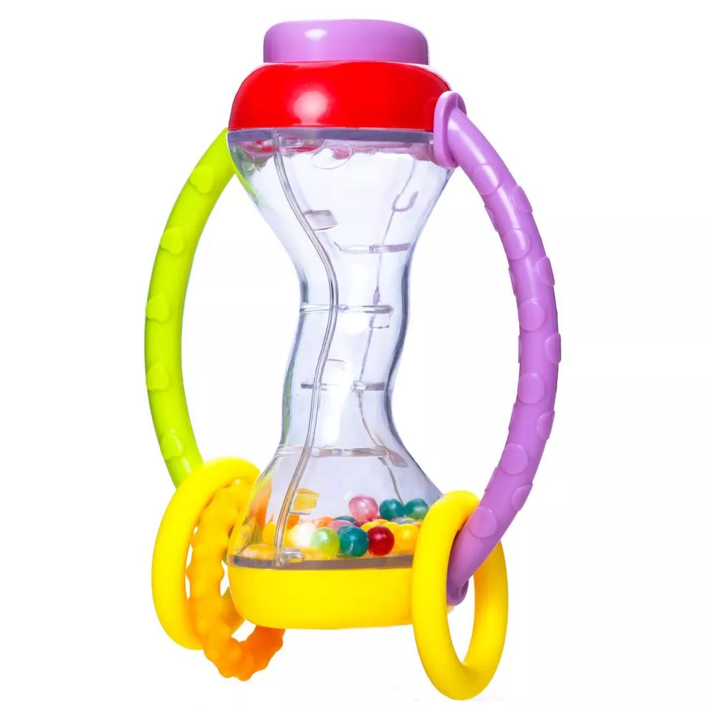 Погремушка-прорезыватель с двумя фактурными ручками, на которых размещены кольца из мягкого пластика. При встряхивании, в прозрачной части игрушки гремят цветные шарики. На одном конце большая кнопка-пищалка. Удобно держать в маленьких руках.