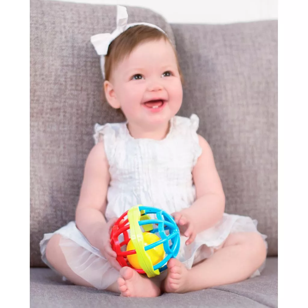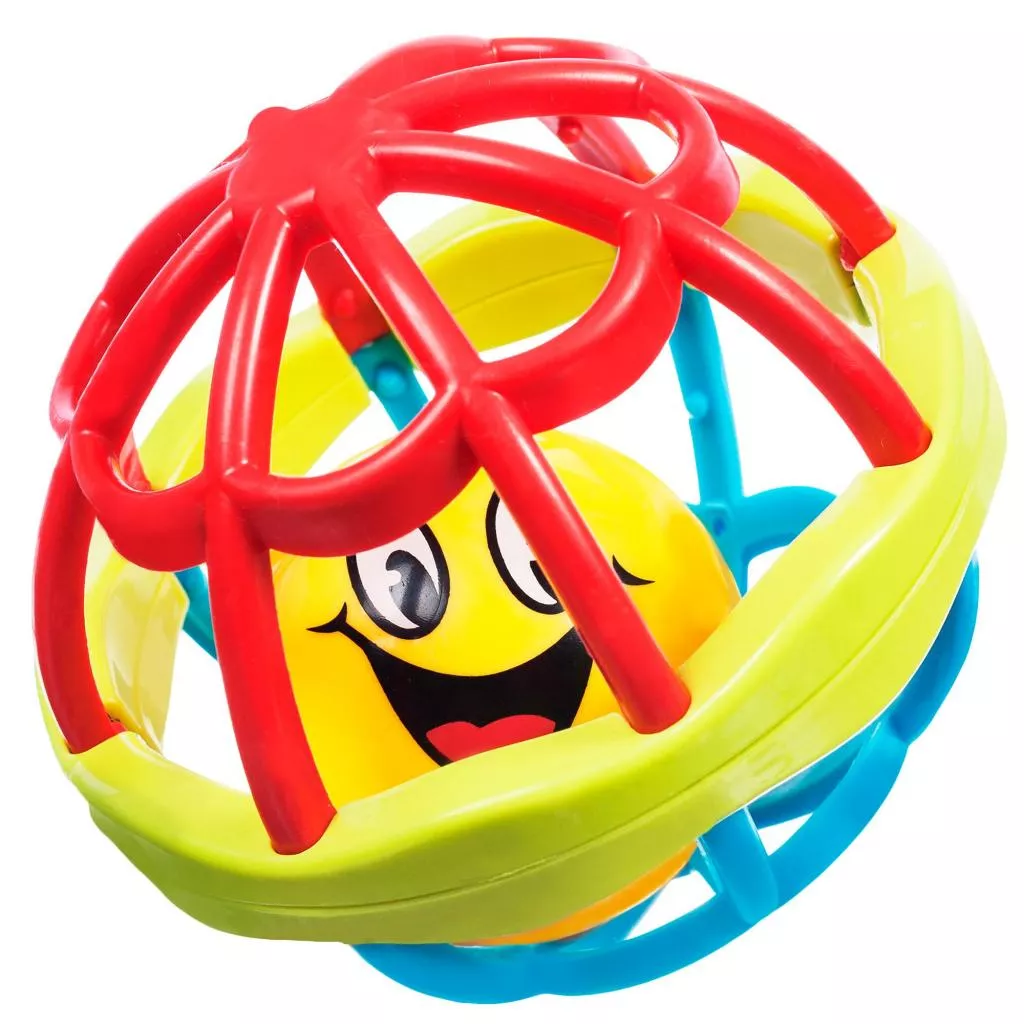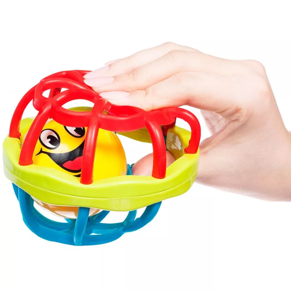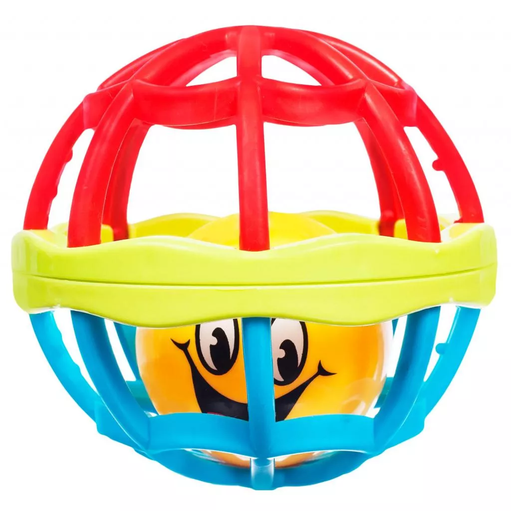 Игрушка круглой формы изготовлены из мягкого пластика, внутри которого вращается мячик в виде смайлика, который звенит при встряхивании.