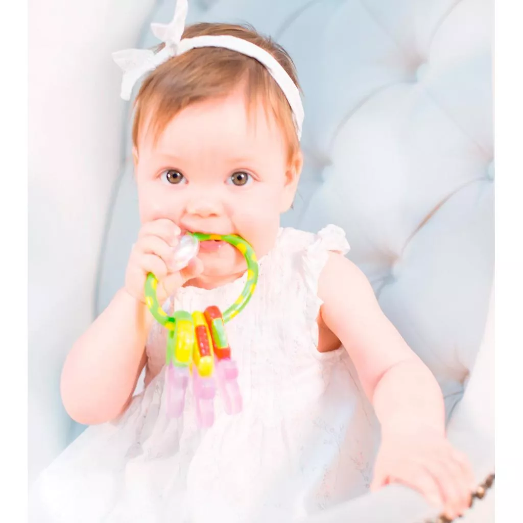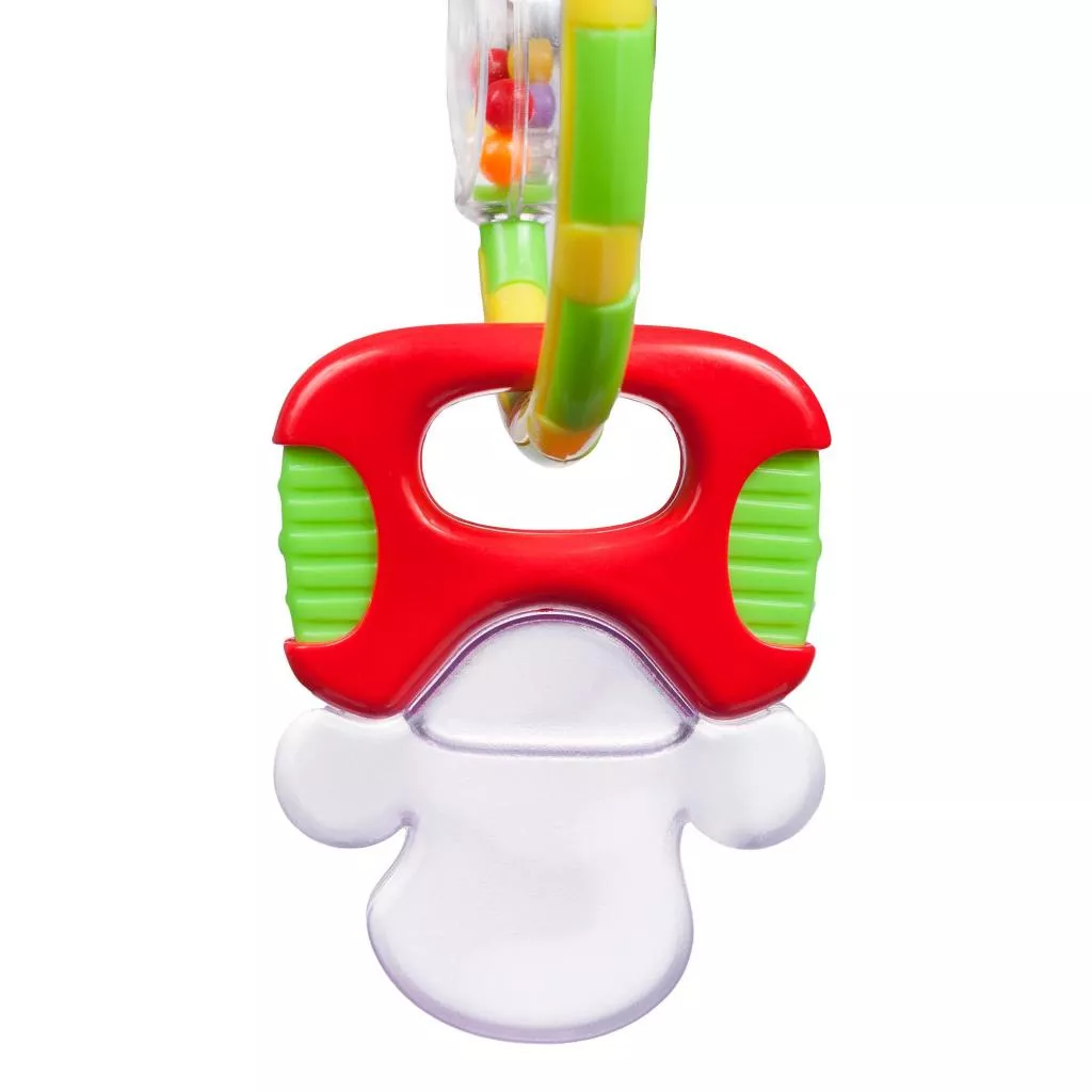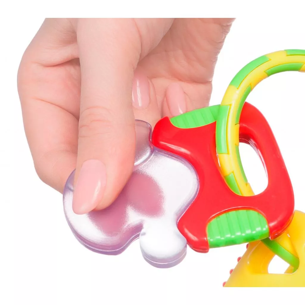 Погремушка-прорезыватель изготовлена из мягкого пластика и имеет фактурную поверхность. Нижние силиконовые части ключиков наполнены дистиллированной водой. Это дает возможность использовать игрушку как прорезыватель для зубов. При встряхивании в прозрачной части звенят цветные шарики. Удобно держать в маленьких ручках.