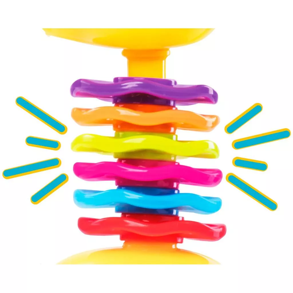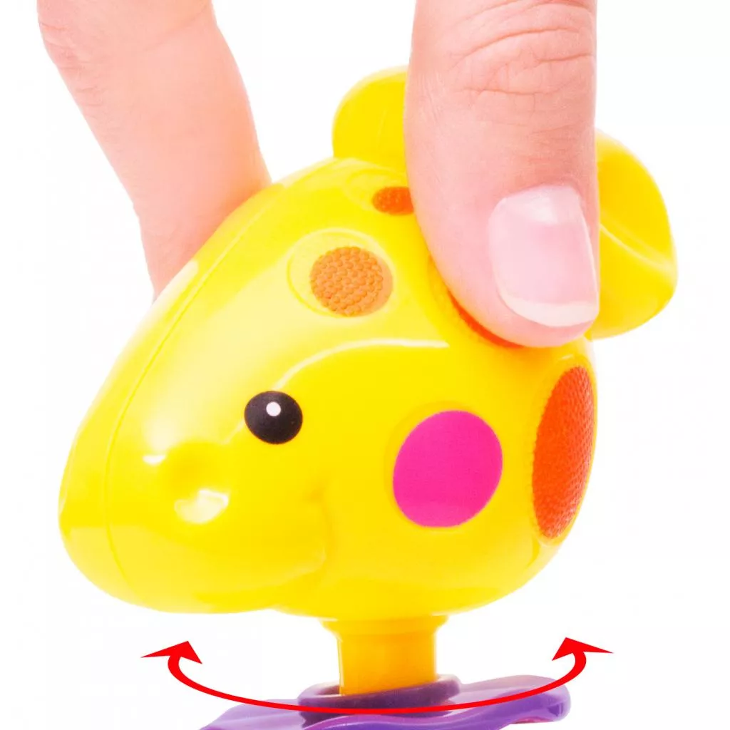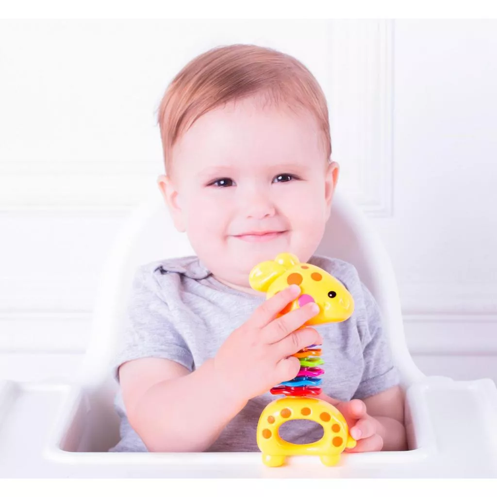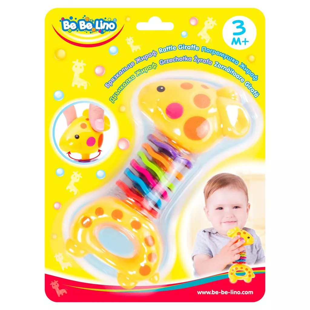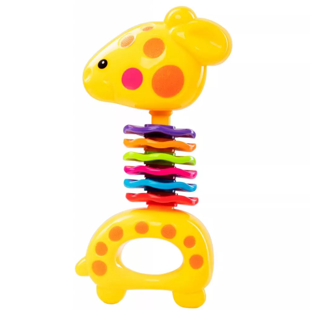 Погремушка с рельефными элементами и подвижными цветными колечками. Голова жирафа поворачивается с клацающими звуками. При встряхивании внутри игрушки звенят маленькие шарики.