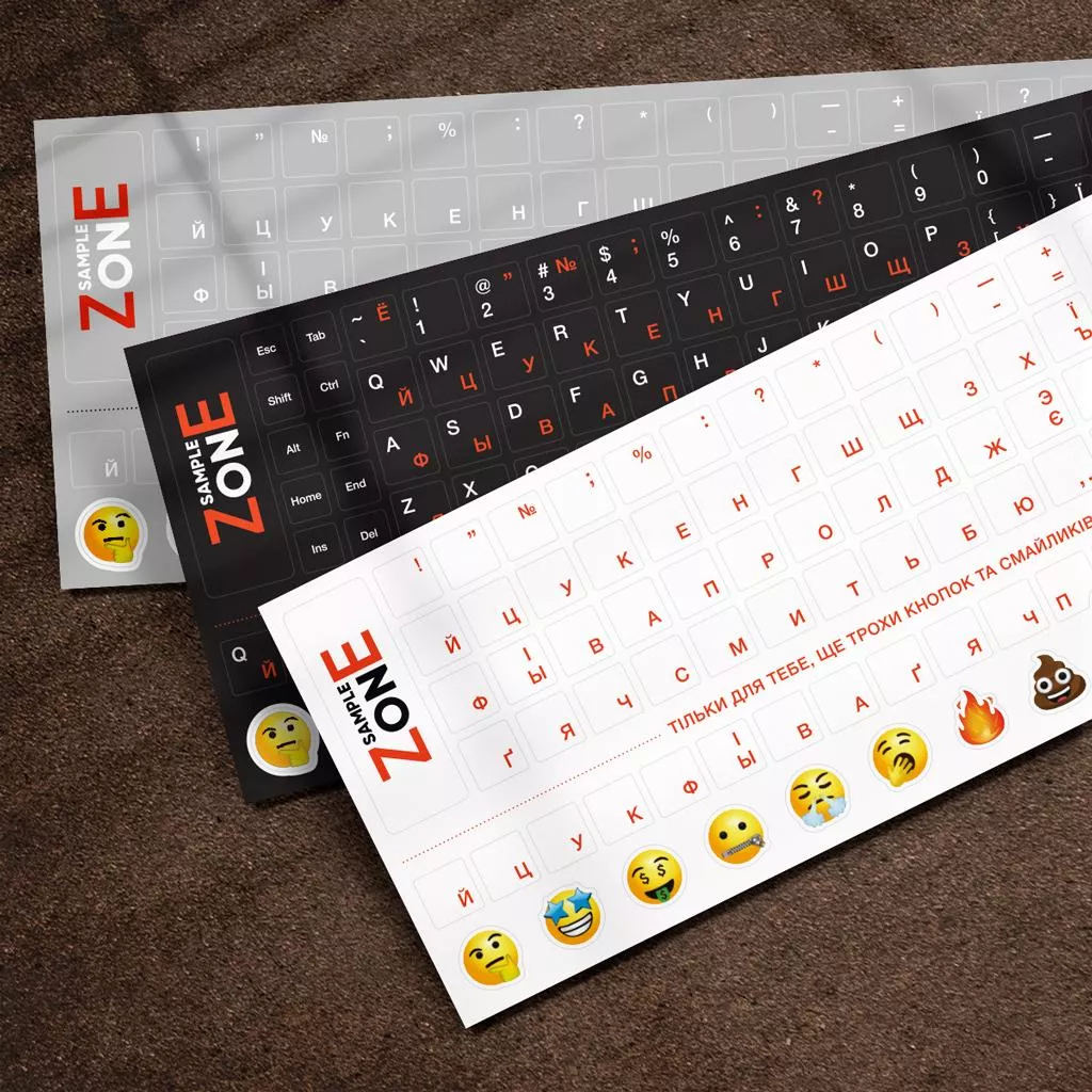Изготовлении по специальной технологии, которая предотвращает стирание букв. Имеет приятную на ощупь поверхность, при наклеивании схожи с пластиковой поверхностью клавиатуры. Высококачественный ультрафиолетовый печать обеспечивает четкое отображение раскладки клавиатуры. Не стираются и не меняют форму при длительном использовании. Имеет дополнительный комплект букв и смайликов. Раскладка: русский / украинский