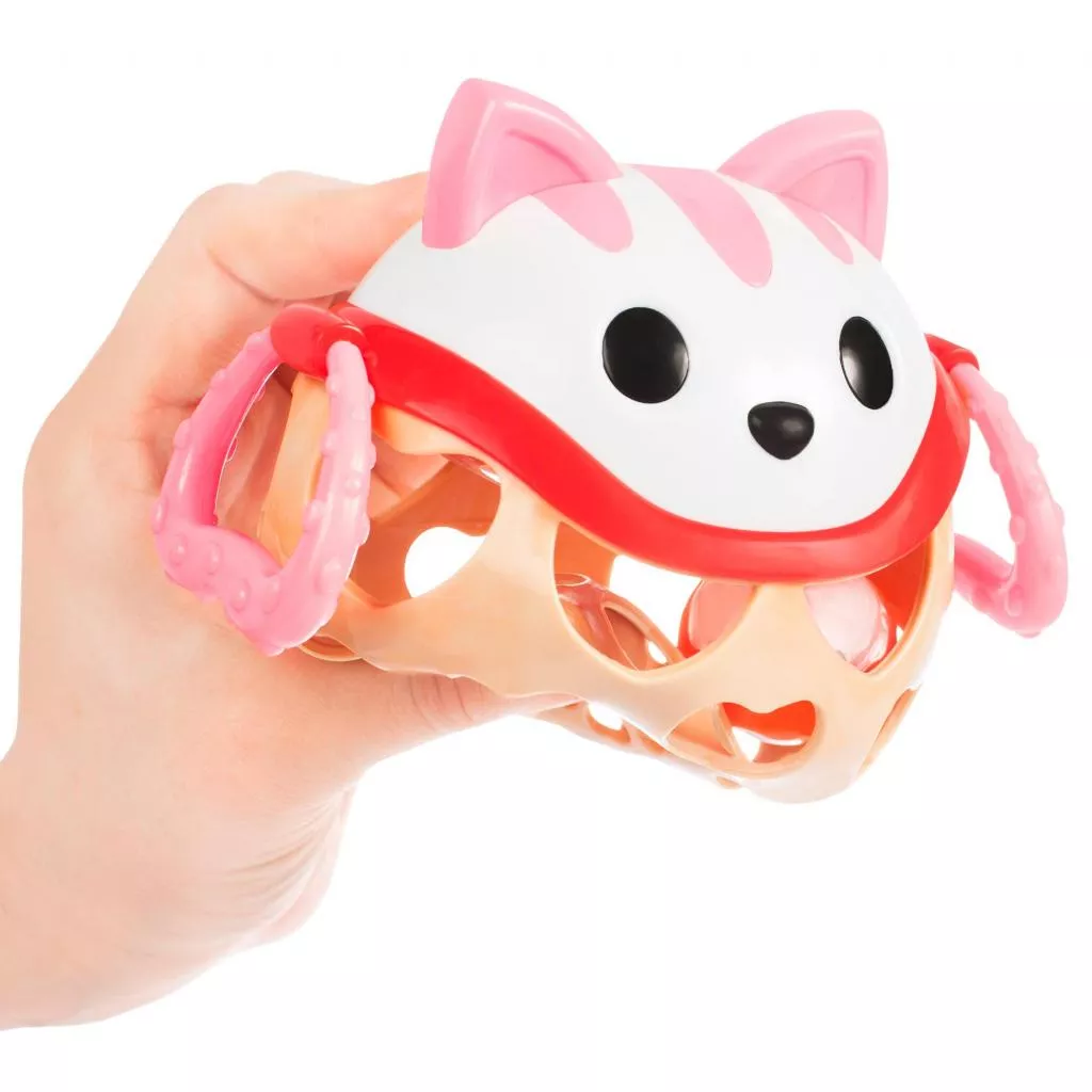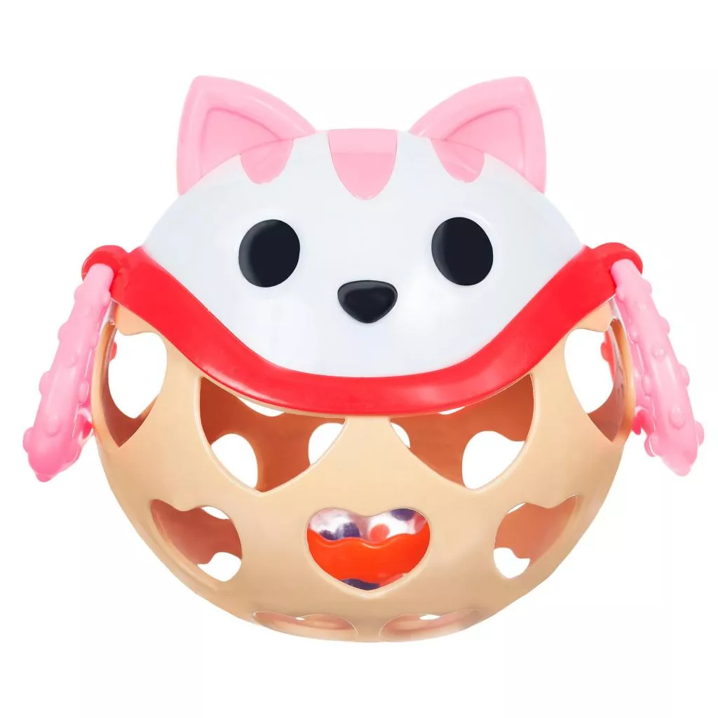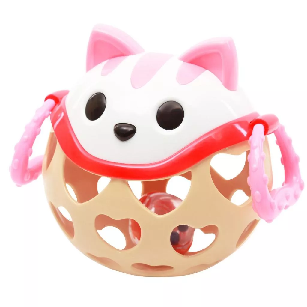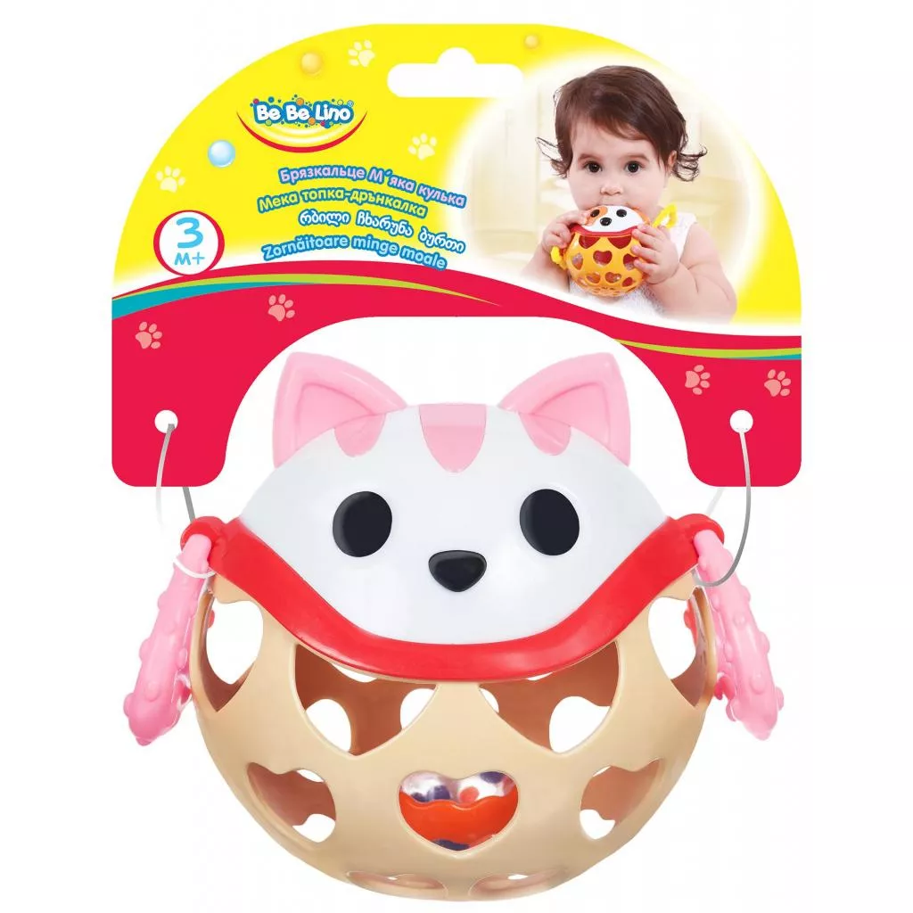Погремушка Мягкий мяч состоит из двух частей: верхняя в виде мордочки кота с торчащими ушками выполнена из твердого пластика, нижняя, мягкая, с прорезями в виде сердечек. По бокам Котика есть фактурные лапки-колечки. Внутри погремушки есть прозрачный мячик, наполненный маленькими шариками, которые тарахтят при встряхивании.