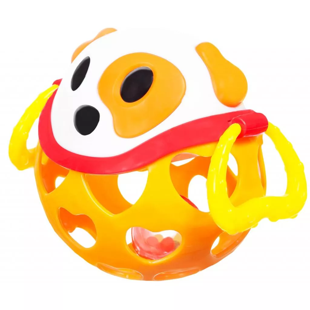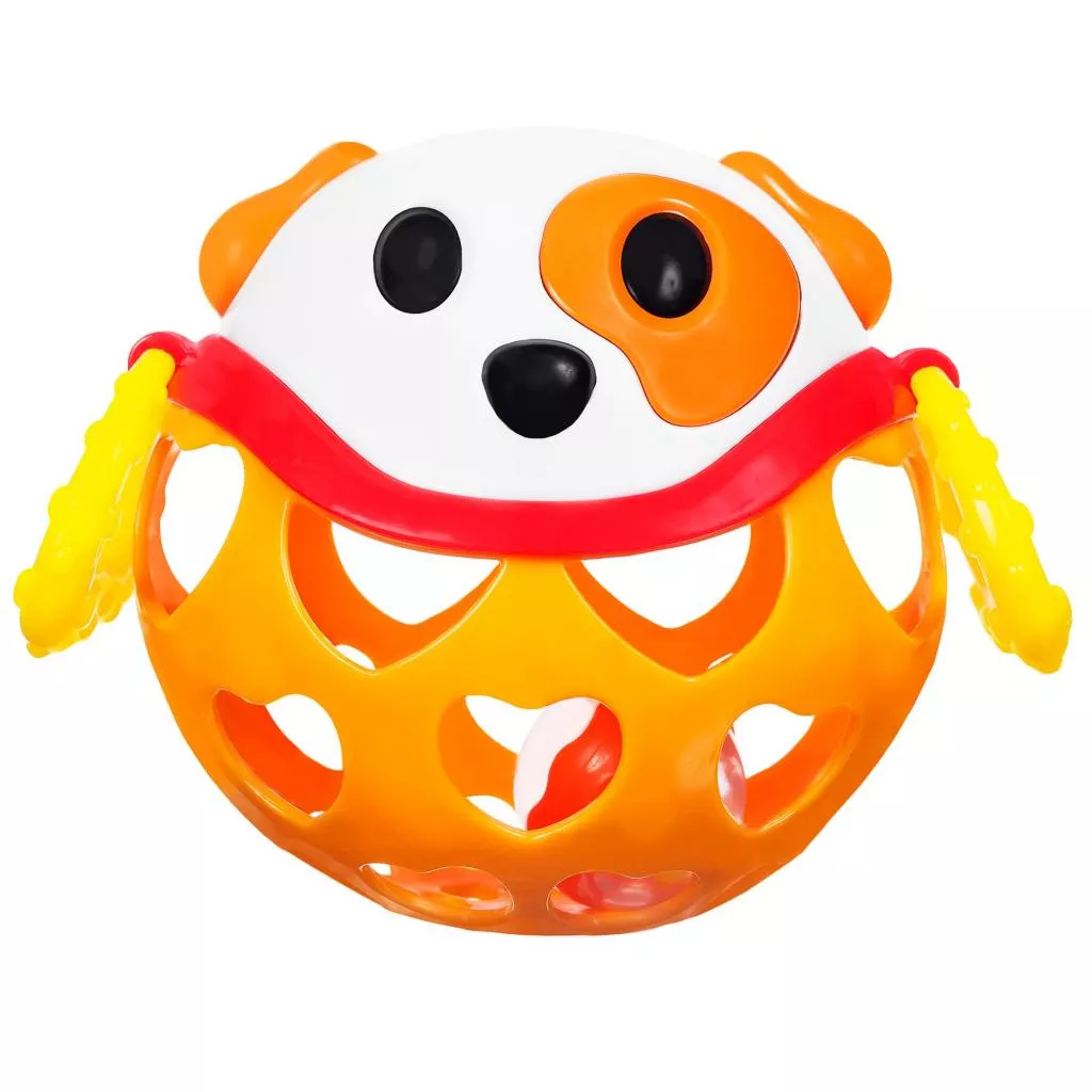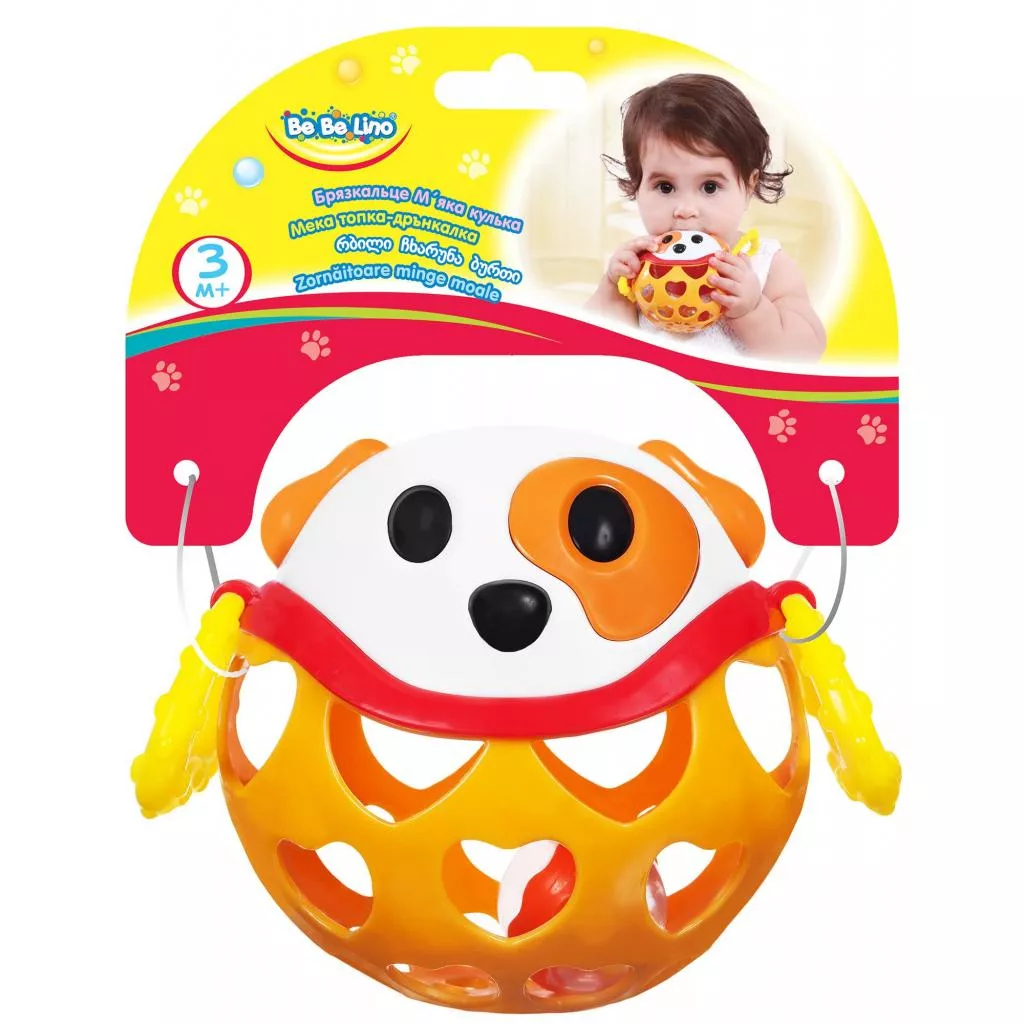 Погремушка Мягкий мяч состоит из двух частей: верхняя в виде мордочки Собаки с торчащими ушками выполнена из твердого пластика, нижняя, мягкая, с прорезями в виде сердечек. По бокам Собачки есть фактурные лапки-колечки. Внутри погремушки есть прозрачный мячик, наполненный маленькими шариками, которые тарахтят при встряхивании.