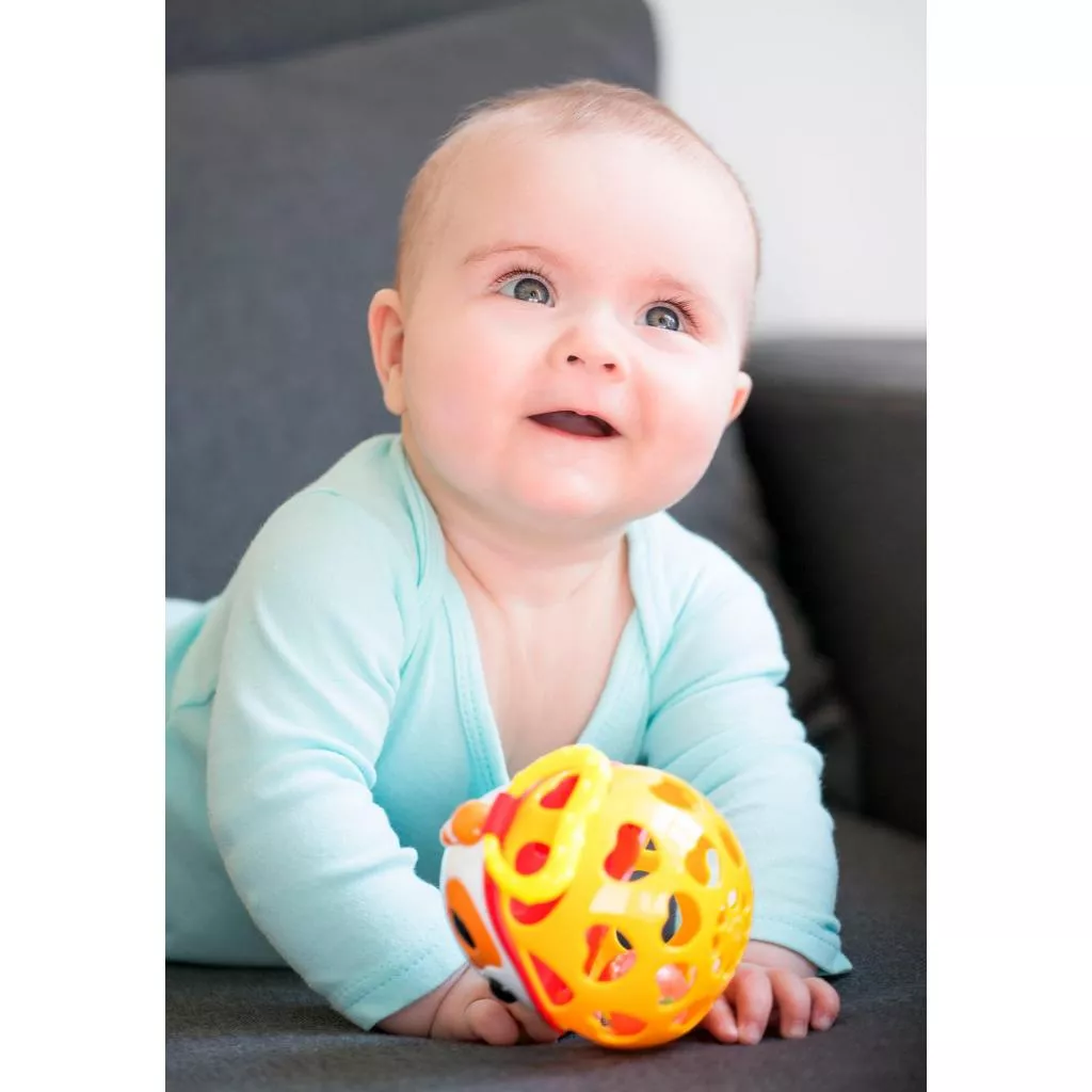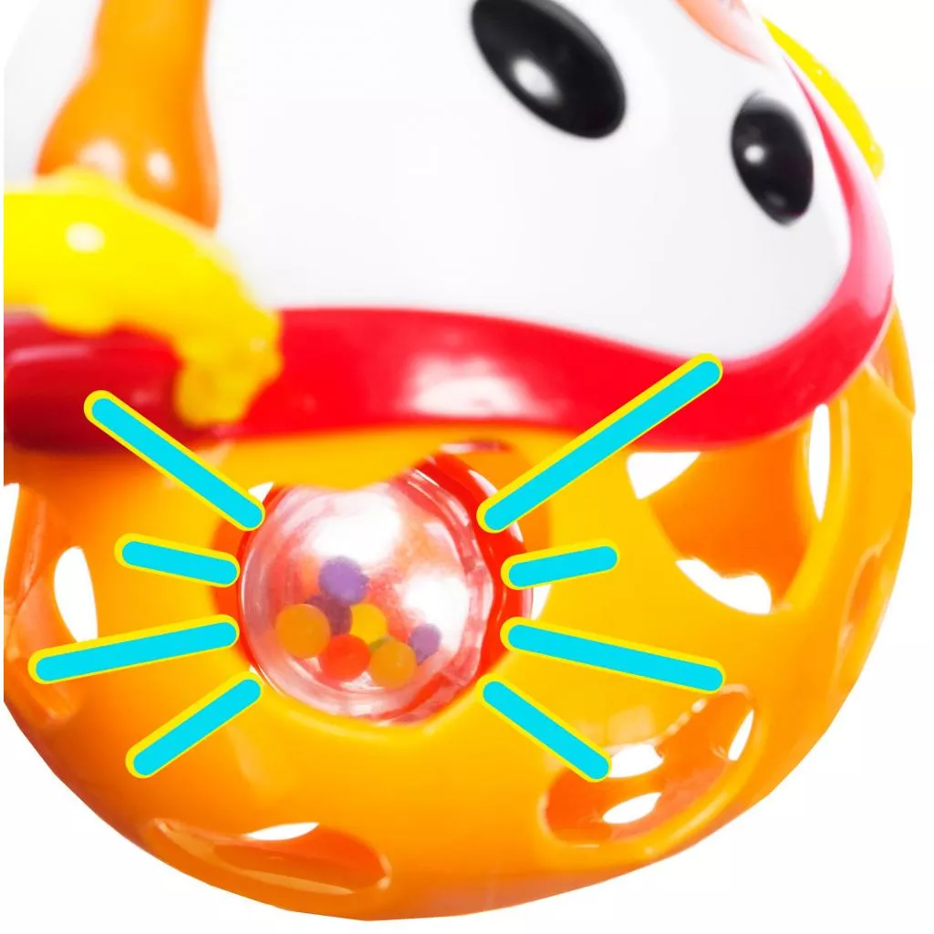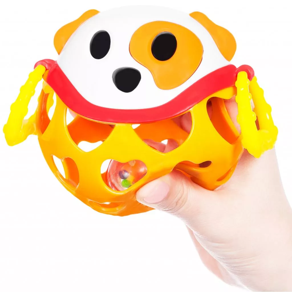 Погремушка Мягкий мяч состоит из двух частей: верхняя в виде мордочки Собаки с торчащими ушками выполнена из твердого пластика, нижняя, мягкая, с прорезями в виде сердечек. По бокам Собачки есть фактурные лапки-колечки. Внутри погремушки есть прозрачный мячик, наполненный маленькими шариками, которые тарахтят при встряхивании.