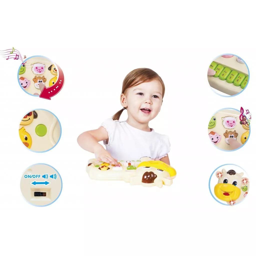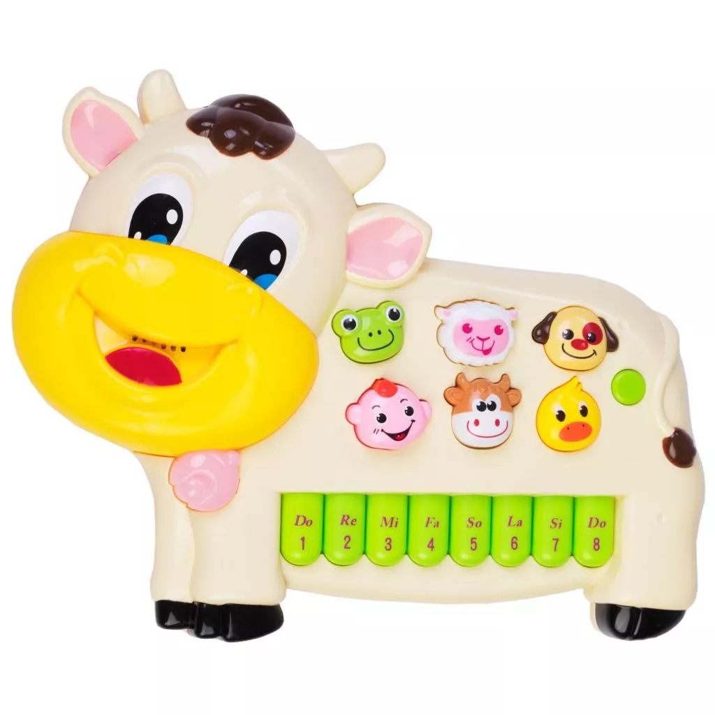 Развивающая интерактивная панель в форме коровки с мелодиями и голосами животных. При нажатии на кнопки в виде мордочек животных звучат их голоса. Клавиши пианино работают в двух режимах: ноты и мелодии. У игрушки есть три звуковых режима, которые переключаются с помощью круглой кнопки: голоса животных, барабанные ритмы, мелодии. На задней стороне игрушки есть регулятор громкости. Игра сопровождается мерцанием лампочек в ушках коровки и колокольчике на шее.