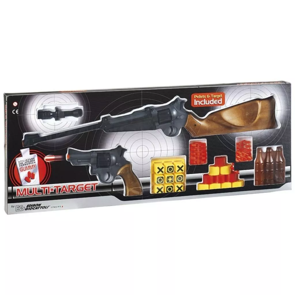Все игрушечные пистолеты и ружья сертифицированы и соответствуют строгим европейским нормам безопасности для ребенка. Edison Giocattoli по сей день производит своё игрушечное оружие в Италии. Набор Edison Giocattoli "Multitarget" - это желанный подарок для каждого мальчика, который обожает игры с погонями, перестрелками и борьбой за справедливость. В наборе предоставлены револьвер "Jeff Watson" и ружьё "Jonny Palmer" три вида мишеней: "банки", "бутылки" и "кубики". Ребёнок может тренироваться в стрельбе по мишени самостоятельно или устроить соревнования на меткость с друзьями. С таким оружием ребёнку удастся научиться стрелять и став метким стрелком, проявить себя защитником, настоящим героем и дать волю своему воображению.