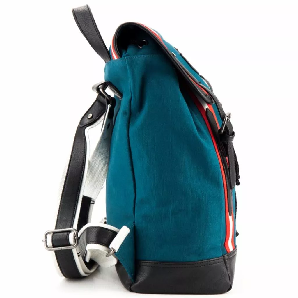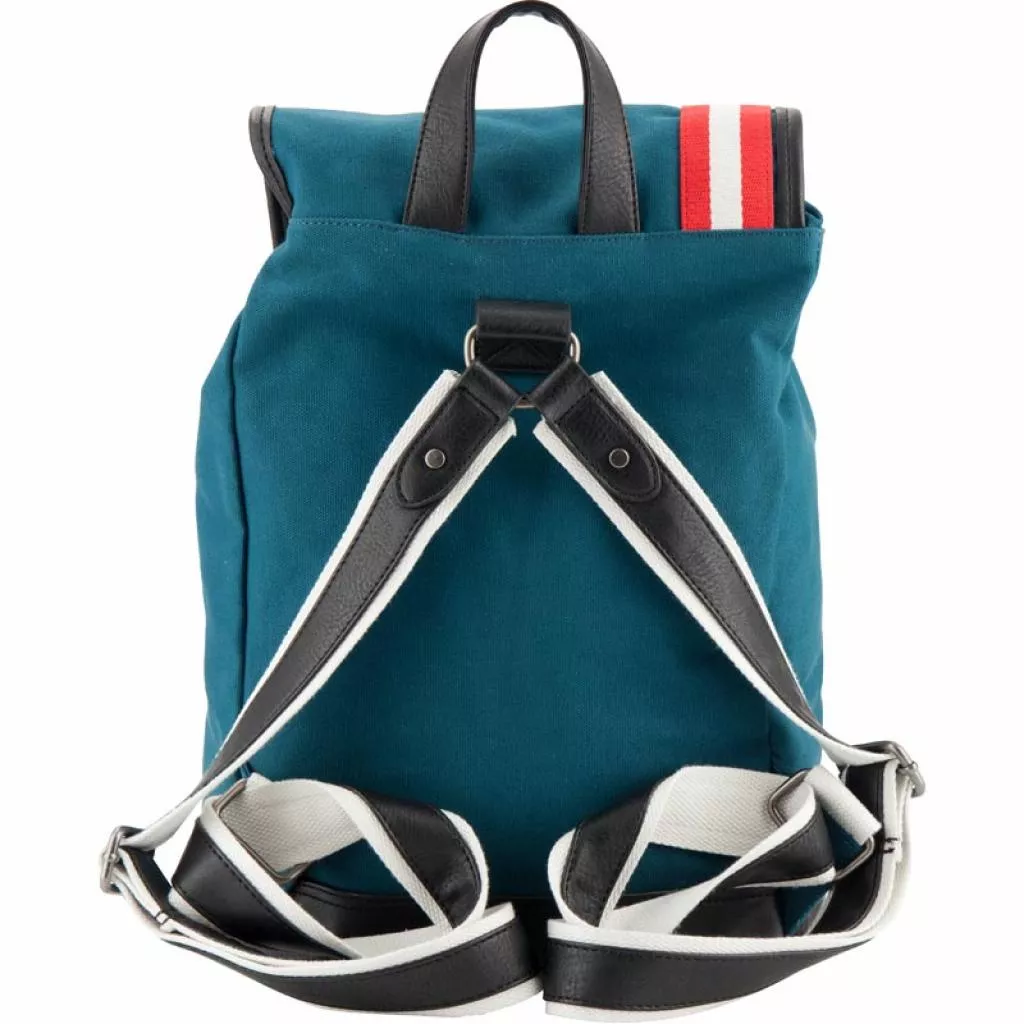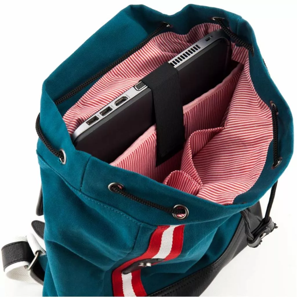 Рюкзак состоит из просторного отделения, кармана для ноутбука и 2 внутренних карманов. Отделение стягивается на шнурке и закрывается на скрытых магнитных кнопках. Магнитные кнопки скрыты под декоративными пряжками. Регулируемые лямки и малый вес, всего 925 г, делают рюкзак комфортным для пользователей. Имеет ручку-петлю. Дно рюкзака, лямки, ручка-петля и ремни выполнены из эко-кожи. Фасад рюкзака украшен сине-красным веббингом на белом фоне.
