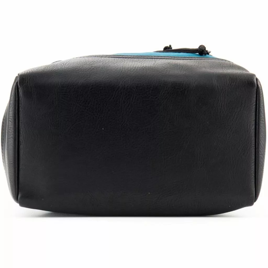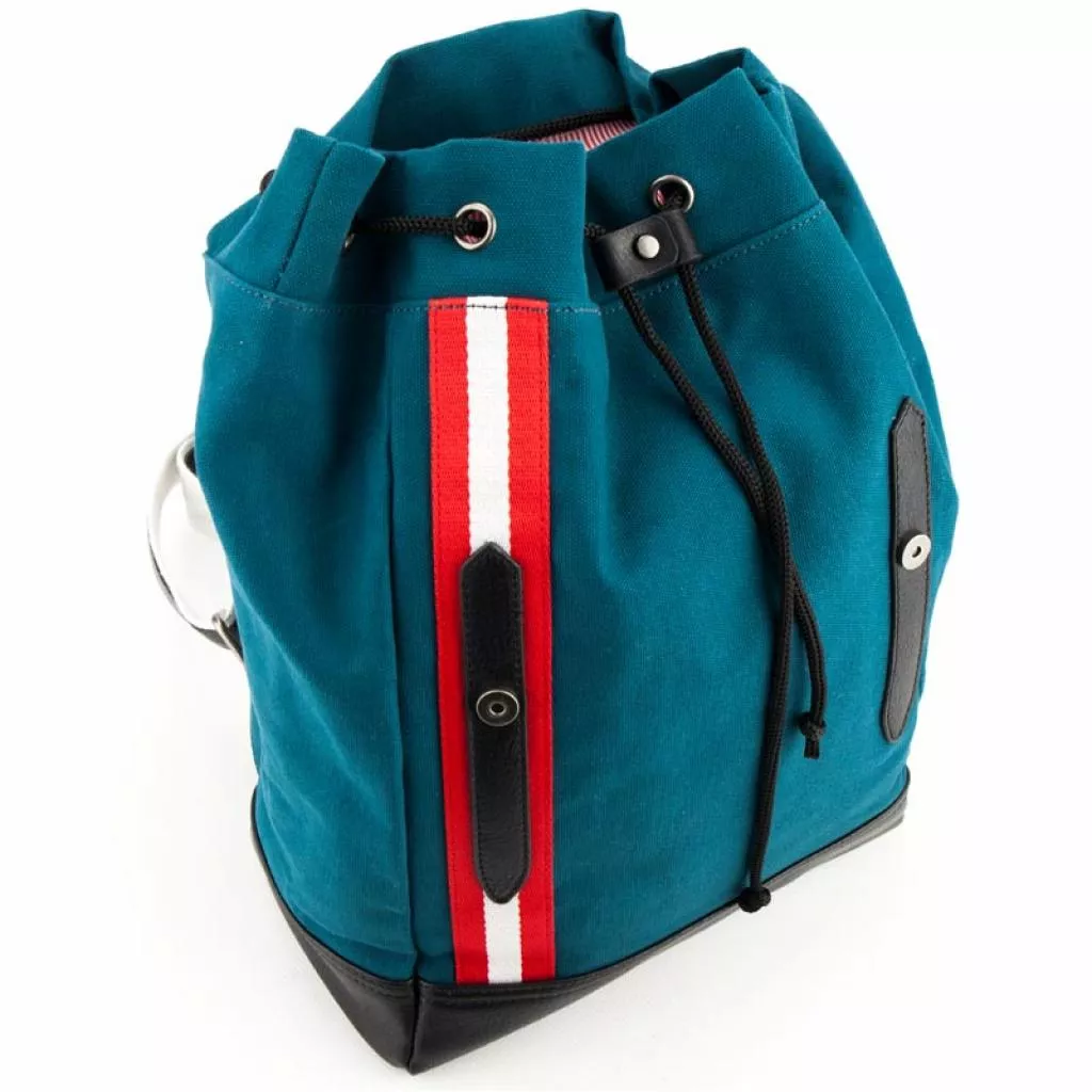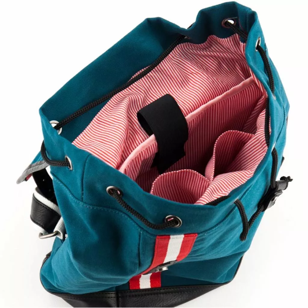 Рюкзак состоит из просторного отделения, кармана для ноутбука и 2 внутренних карманов. Отделение стягивается на шнурке и закрывается на скрытых магнитных кнопках. Магнитные кнопки скрыты под декоративными пряжками. Регулируемые лямки и малый вес, всего 925 г, делают рюкзак комфортным для пользователей. Имеет ручку-петлю. Дно рюкзака, лямки, ручка-петля и ремни выполнены из эко-кожи. Фасад рюкзака украшен сине-красным веббингом на белом фоне.