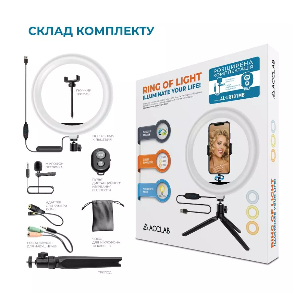 Комплектация | держатель телефона, кольцевая LED лампа, петличный микрофон, пульт ДУ, штатив-трипод |