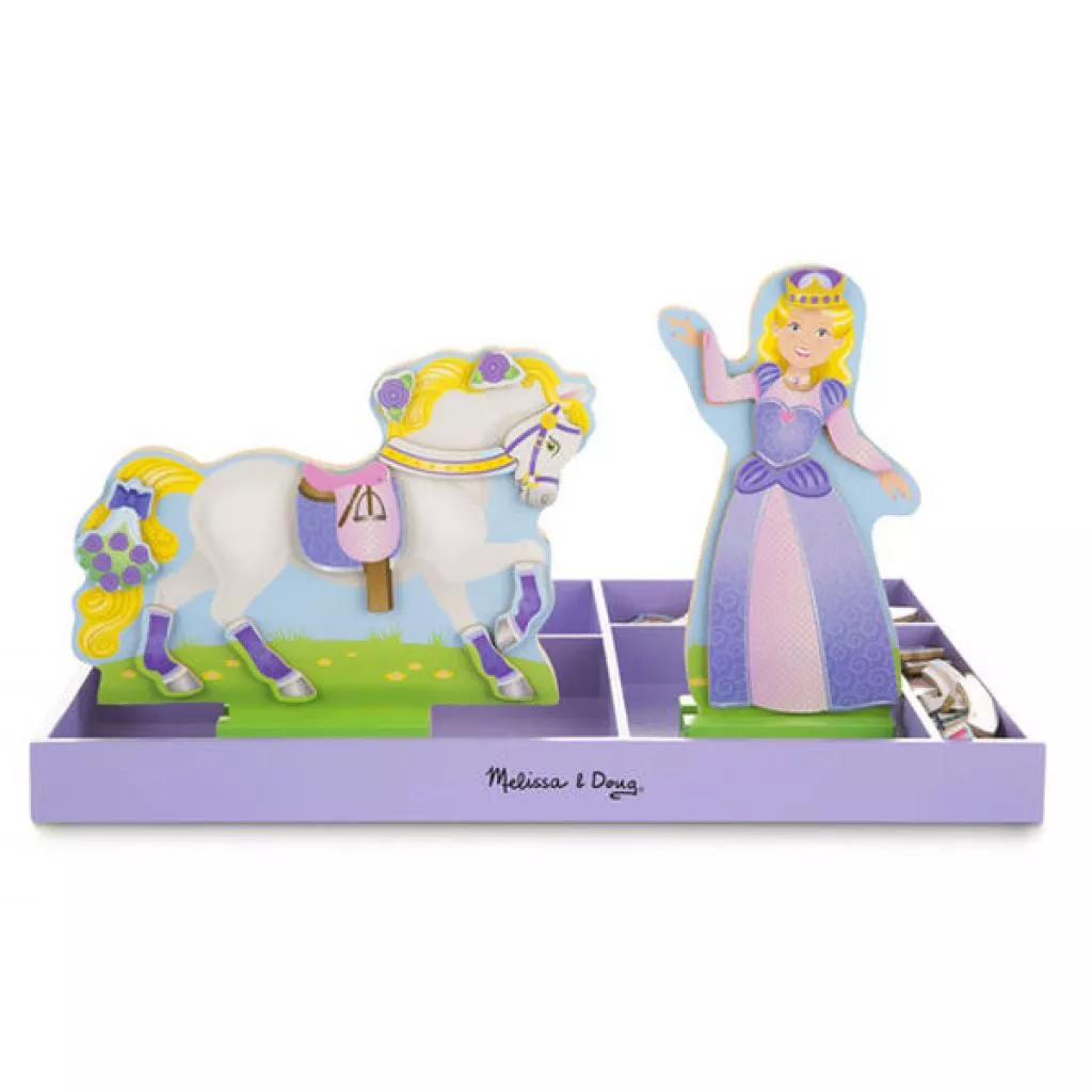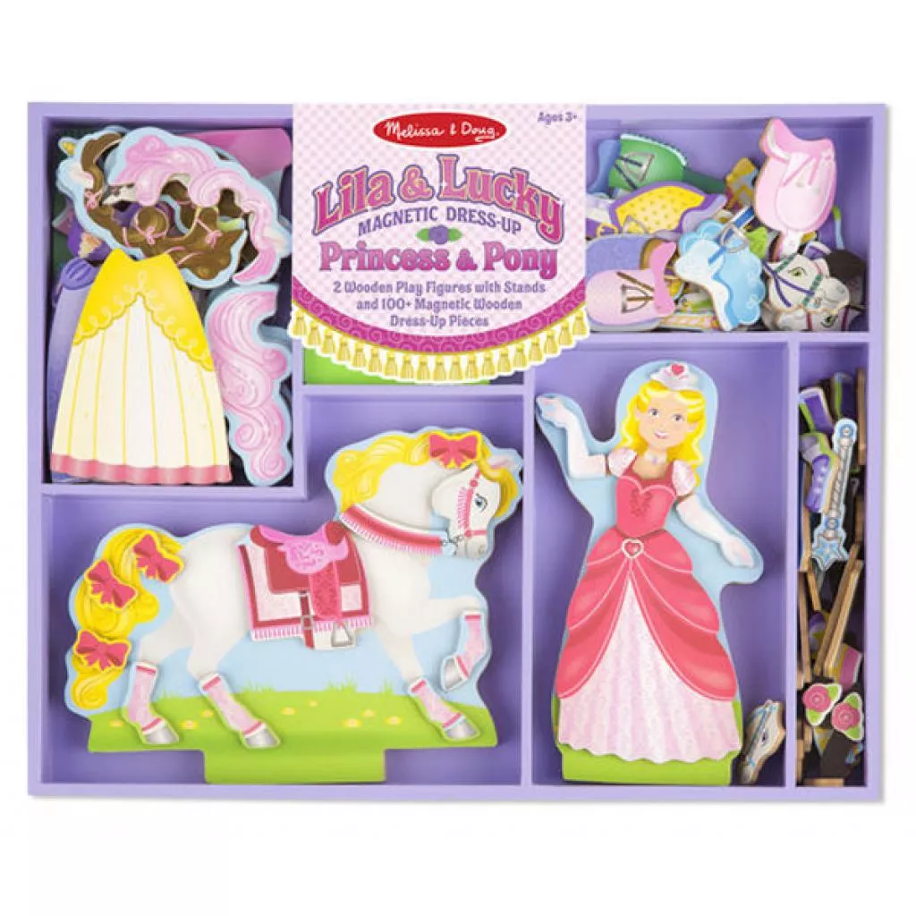 Одень и укрась эту прекрасную принцессу и ее потрясающую лошадь с помощью 9 сочетаний нарядов - или комбинируй, чтобы создать совершенно уникальный образ! Просто поместите магнитные деревянные игровые фигуры на их трибуны и начните дополнять их аксессуарами Lila и Lucky - более 100 магнитных фигур, включая плавные платья, скипетры, диадемы для Lila и седла, уздечки, гривы, хвосты и даже крылья для Lucky. Бесконечные варианты. Когда пришло время для нового приключения, удаляйте и переставляйте кусочки снова и снова. А когда закончится игровое время, аккуратно храните все в прочном деревянном подносе, который также отлично подходит для сортировки, подсчета и сопоставления действий.