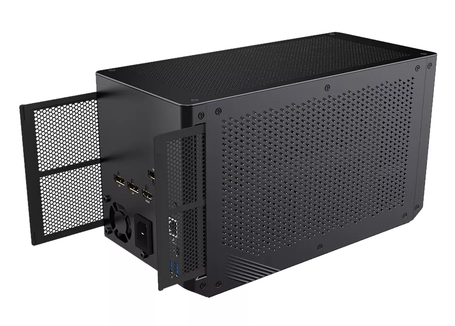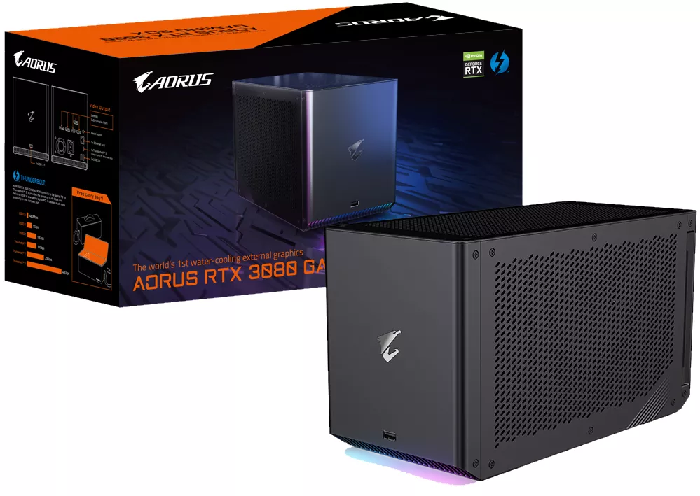 GIGABYTE AORUS RTX 3080 GAMING BOX (GV-N3080IXEB-10GD) – внешняя видеокарта, предназначенная для подключения посредством Thunderbolt 3. Модель изготовлена на основе чипом NVIDIA Ampere, которые получили существенный прирост производительности как в современных играх, так и требовательных задачах, связанных с обработкой графики, искусственным интеллектом. GIGABYTE AORUS RTX 3080 GAMING BOX (GV-N3080IXEB-10GD) устанавливается в фирменный корпус и дополняется системой водного охлаждения с массивными 120 мм вентиляторами и композитными теплотрубками. Частота работы видеокарты составляет 1710 МГц, а видеопамяти типа GDDR6X устанавливается 10 ГБ. Для подключения периферии в GIGABYTE AORUS RTX 3080 GAMING BOX (GV-N3080IXEB-10GD) предусмотрены порты USB 3.0. Важной особенностью устройства является наличие встроенного Ethernet и поддержки Power Delivery 3.0.