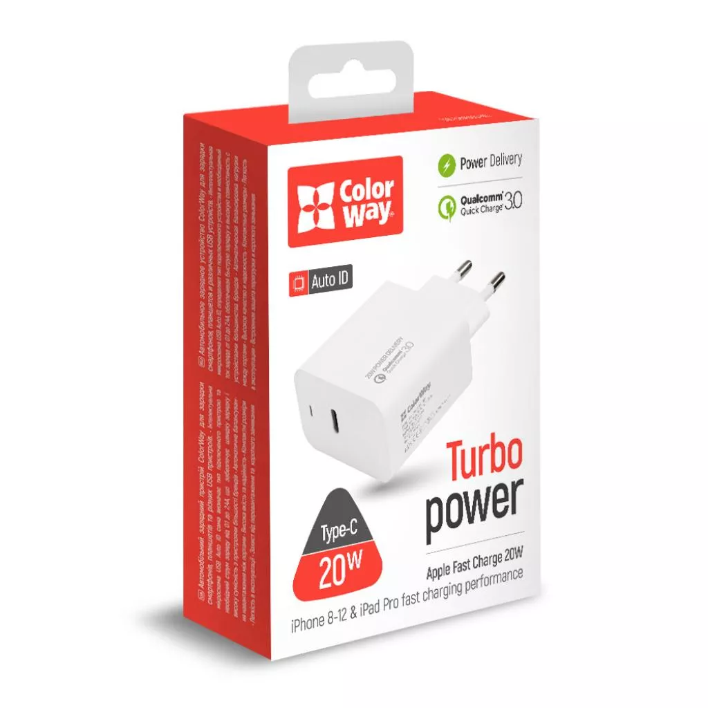 Сетевое зарядное устройство ColorWay Power Delivery 20W оснащен и укомплектован портом USB-C Power Delivery 3.0 для зарядки 20 Вт. Идеально подходит для зарядки Apple iPhone 12 Pro / 12 Pro Max / 12 mini / 12/11 Pro / 11 Pro Max / 11 / SE / XS / XS Max / XR / X / 8/8 Plus, Apple iPad Pro 12.9 / iPad Pro 11 "/ iPad Pro 11 на полной скорости. IPhone 12 Pro можно зарядить от 0% до 50% всего за 30 минут. Устройство быстрой зарядки USB-C оснащен и укомплектован интеллектуальным чипом для защиты ваших устройств от короткого замыкания, перенапряжения, перегрева и перегрузки по току . Огнестойкий корпус ABS не перегревается при зарядке, обеспечивая отличную производительность, независимо от царапин, ударов или падений. Защитите себя и свое оборудование изнутри.