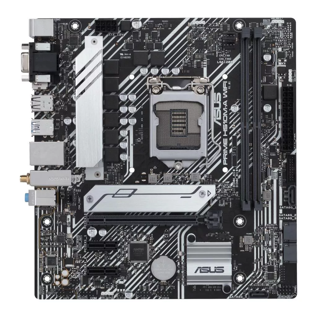 Материнская плата с чипсетом Intel H510: процессорный разъем LGA 1200, форм-фактор micro-ATX, PCIe 4.0, слот M.2 (32 Гбит/с), Intel Wi-Fi 5, Intel 1G Ethernet, DisplayPort, HDMI, D-Sub, USB 3.2 Gen1 Type-A, SATA 6 Гбит/с, разъемы для адресуемой подсветки Aura