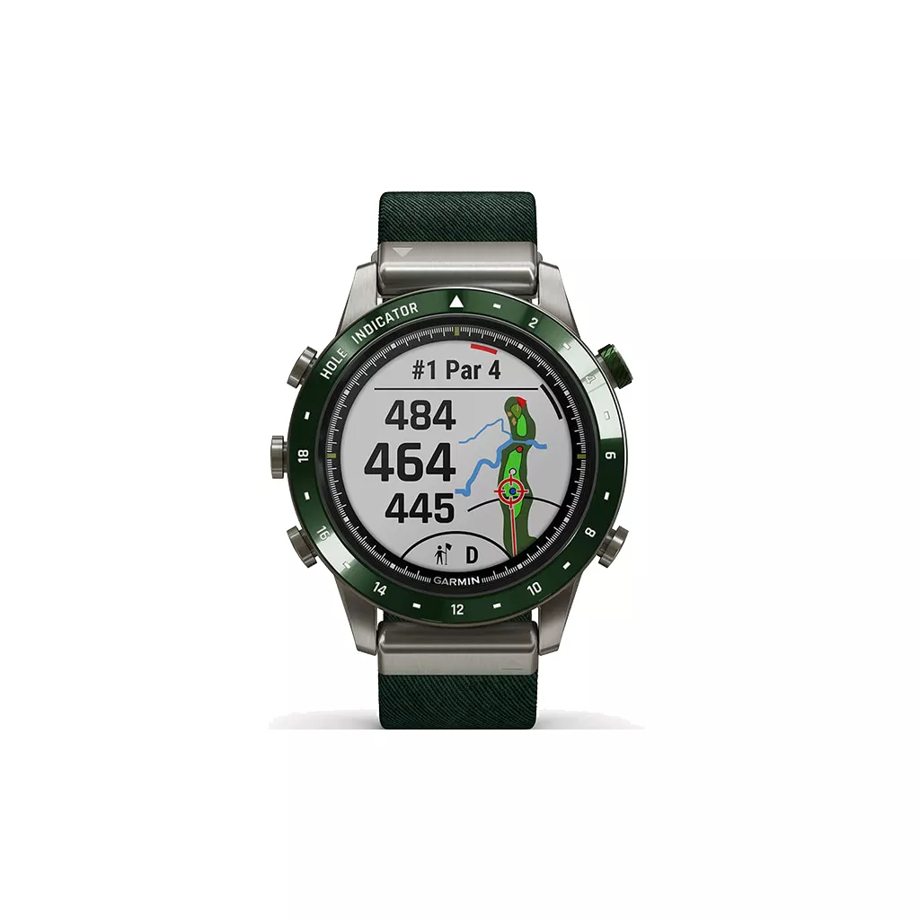 Эти роскошные часы с выпуклым сапфировым стеклом, постоянно включенным дисплеем и 18 отметками в форме лунок на кольце вокруг циферблата наглядно демонстрирует вашу привязанность к гольфу.