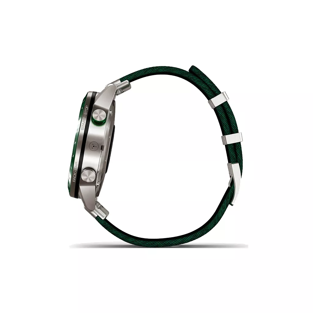 Устройство, предназначенное для поклонников гольфа, характеризуется керамическим кольцом 46 мм, зеленым нейлоновым ремешком в технике жаккардового плетения. и обтекаемой конструкцией, которая не будет мешать во время игры.