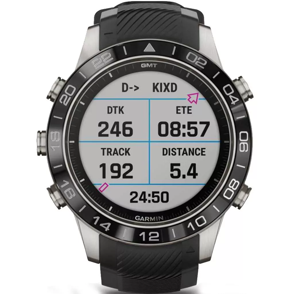Часы Garmin MARQ Aviator предназначены для авиаторов. Титановый корпус с DLC-покрытием, в сочетании с сапфировым стеклом и титановым ремешком обеспечивают чрезвычайную надежность часов. Керамический GMT-безель дает пилотам быстрый доступ к GMT-времени (среднее время по Гринвичу), на циферблате также два дополнительных часовых пояса с кодами местных аэропортов. Часы имеют метеорологический радар NEXRAD, авиационную навигацию и всемирную базу аэропортов. возможность в случае необходимости начать навигацию.