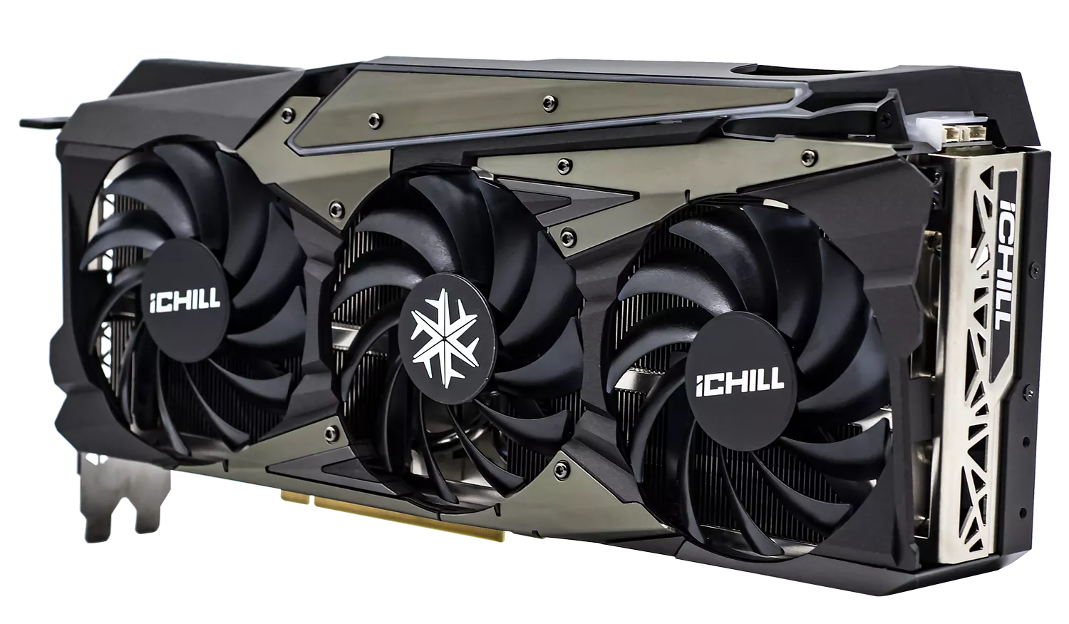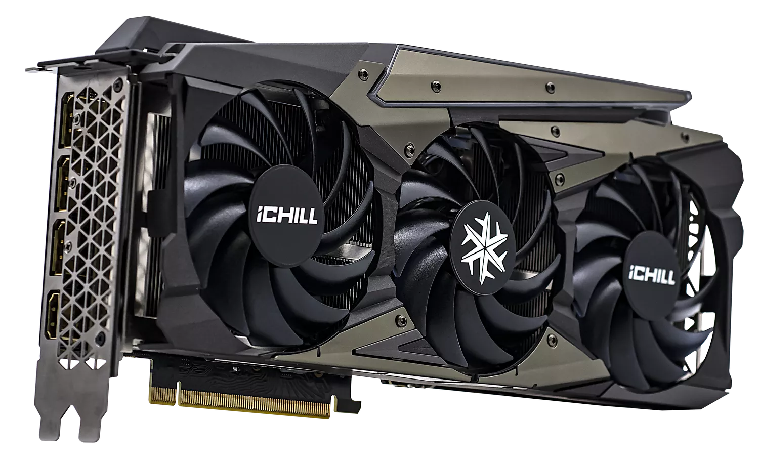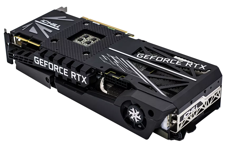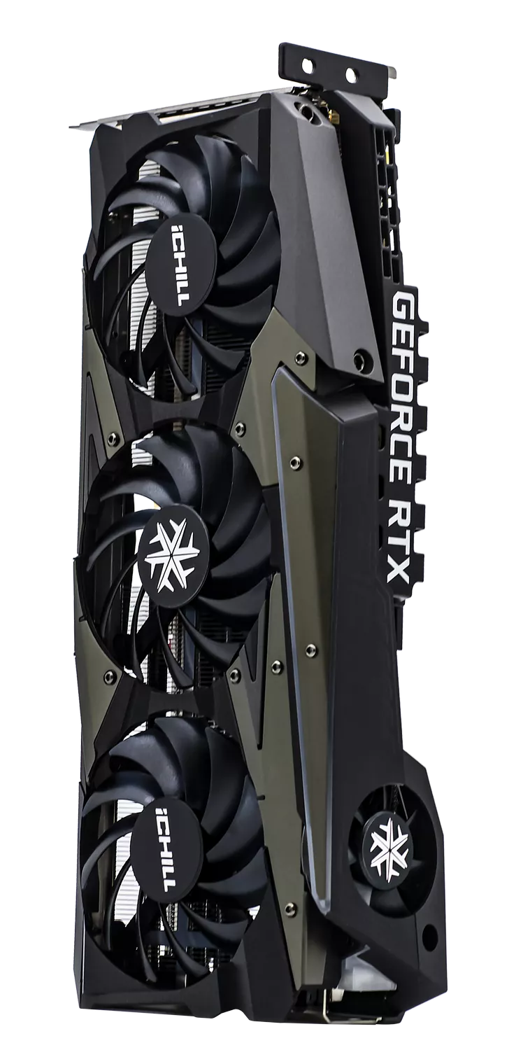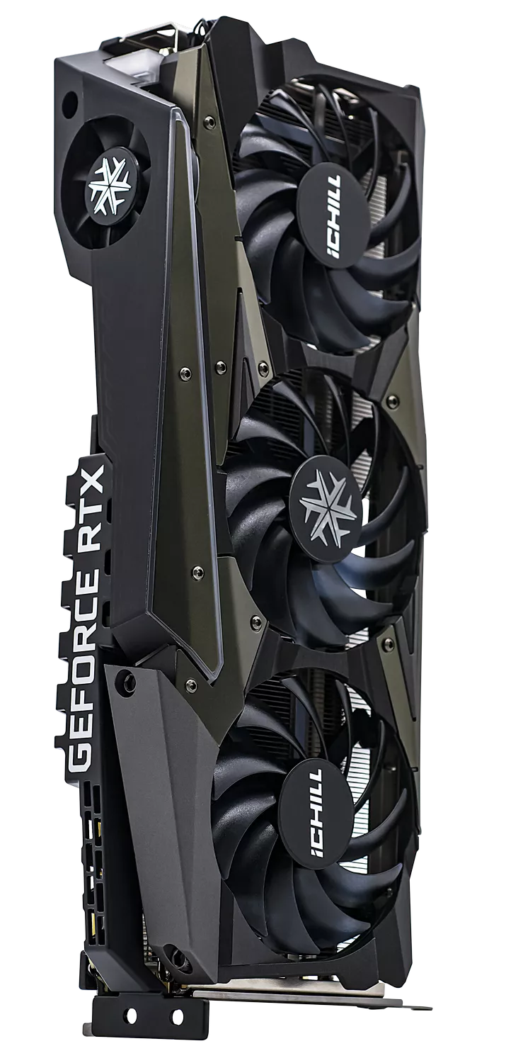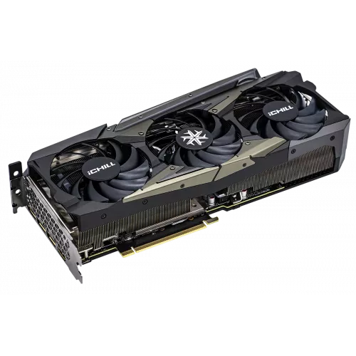 RTX 3080 Ti iCHILL X4 - игровая видеокарта, охлаждение которой обеспечивается тремя мощными вентиляторами, соединенными с алюминиевым радиатором, способствующим отводу тепла.