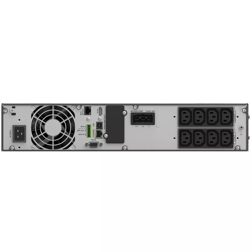 для сетевого оборудования, непрерывного действия (on line), 2000 Вт, 2000 В*А, чистая синусоида, 160 до 300 В, АКБ – встроенная, 12V/7AH x 6, LCD – дисплей, 438 х 85.5 х 600 мм.