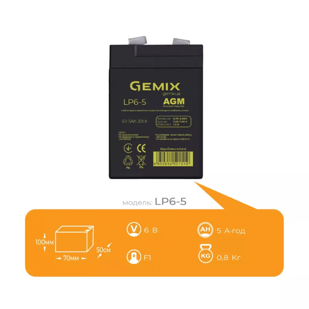В, 5 Ач, Клеммы – F1, 70х50х100 мм, 0.8 кг