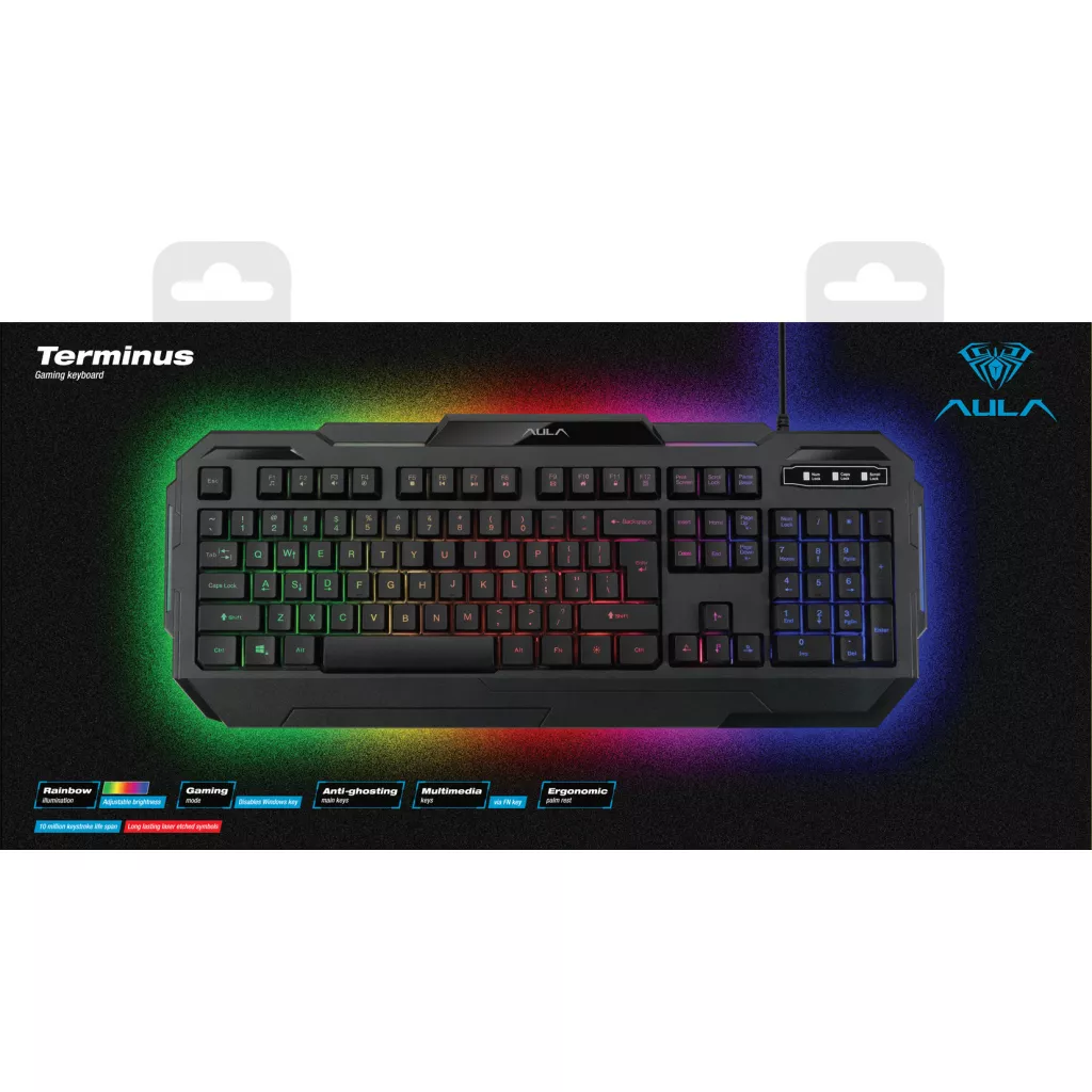 Для многих самый красивый набор компьютерного оборудования – черного цвета. Черный монитор, черная мышь, черная клавиатура, стол, коврик… Но нет ничего плохого в том, что даже самому большому поклоннику черного цвета иногда хочется добавить в него немного шарма. Для этого и была создана клавиатура AULA Terminus! Абсолютно минималистичен по стилю, но скрывает под клавишами радужную подсветку, от которой сразу становится веселее. И это еще не самая лучшая часть этой клавиатуры! «Стакан с водой, падающей прямо на клавиатуру» – едва ли не самый страшный кошмар всех любителей компьютерных игр. Теперь над этим сном можно только посмеяться, потому что в AULA Terminus интегрированные еды заметны дренажные канавки, через которые вода стечет быстрее, чем ты наберешь asdf.