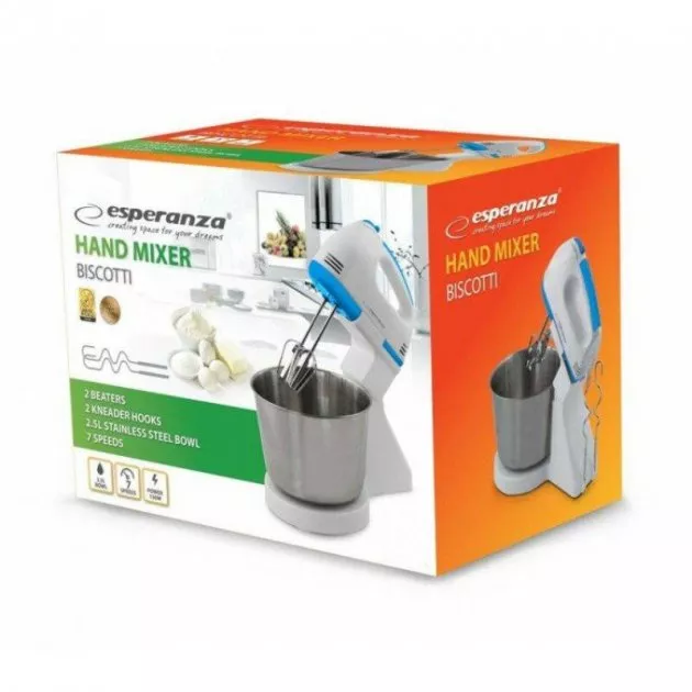 Миксер-тестомес Esperanza EKM019W Biscotti оснащен большой чашей и подставкой для миксера, которая полностью освобождает руки при перемешивании.