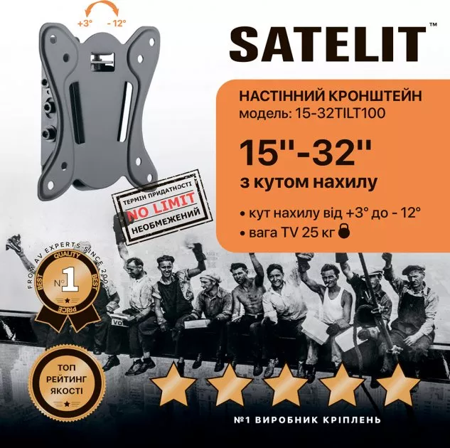 Вопрос о размещении телевизора не менее актуален, нежели сама покупка устройства. С учетом компактности, обеспеченной плоским экраном, панель все же занимает немалую площадь помещения, если установлена с помощью стандартной подставки, и такую же немалую роль отыгрывает в интерьере. Кронштейн решает не только проблему экономии пространства, но и позволяет разместить экран в удобной точке квартиры, на любом расстоянии и высоте от зрителя. Данный крепеж предназначен для настенной установки телевизоров или мониторов с размерами экранов от 15" до 32". Наклонная конструкция кронштейна Satelit 15-32TILT100 - это особо удобно и важно, если панель расположена выше уровня глаз и для комфортного просмотра контента необходимо адаптировать положение экрана.