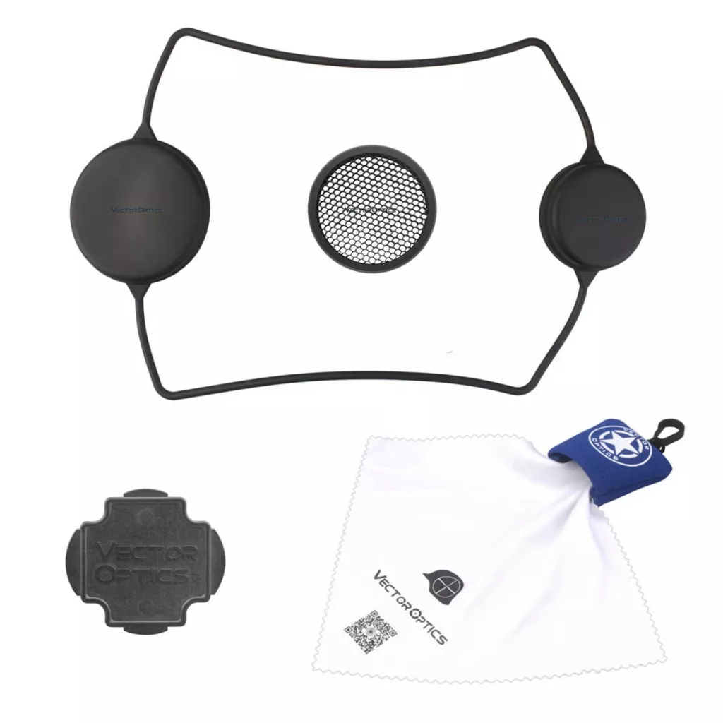 Поставляется со съемным рычагом изменения кратности, кольцами для установки на планку Пикатины, сотовой блендой.