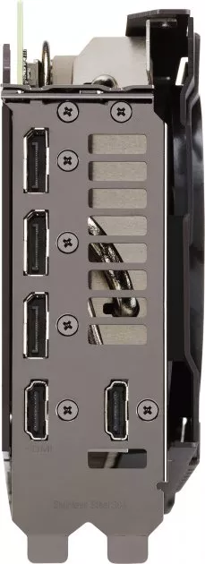 На обратной стороне видеокарты можно заметить множество улучшений по сравнению с ее предшественницами. Большая ее часть закрыта защитной металлической пластиной с широким вентиляционным отверстием. Через это отверстие горячий воздух от видеокарты отводится к вытяжным корпусным вентиляторам. Для защиты портов и обеспечения надежного крепления задняя панель видеокарт изготавливается из нержавеющей стали. Также можно отметить удобно расположенный переключатель двух профилей BIOS, с помощью которого выбирается режим работы видеокарты – без использования какого-либо программного обеспечения.