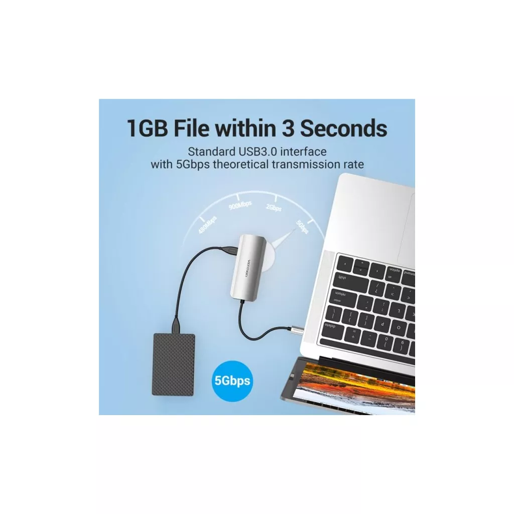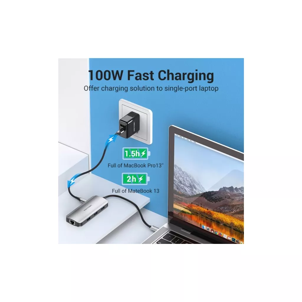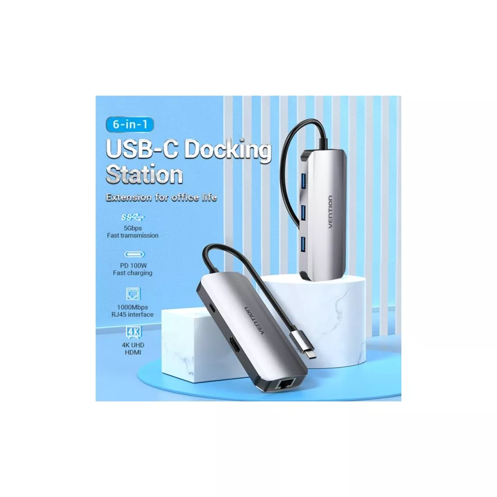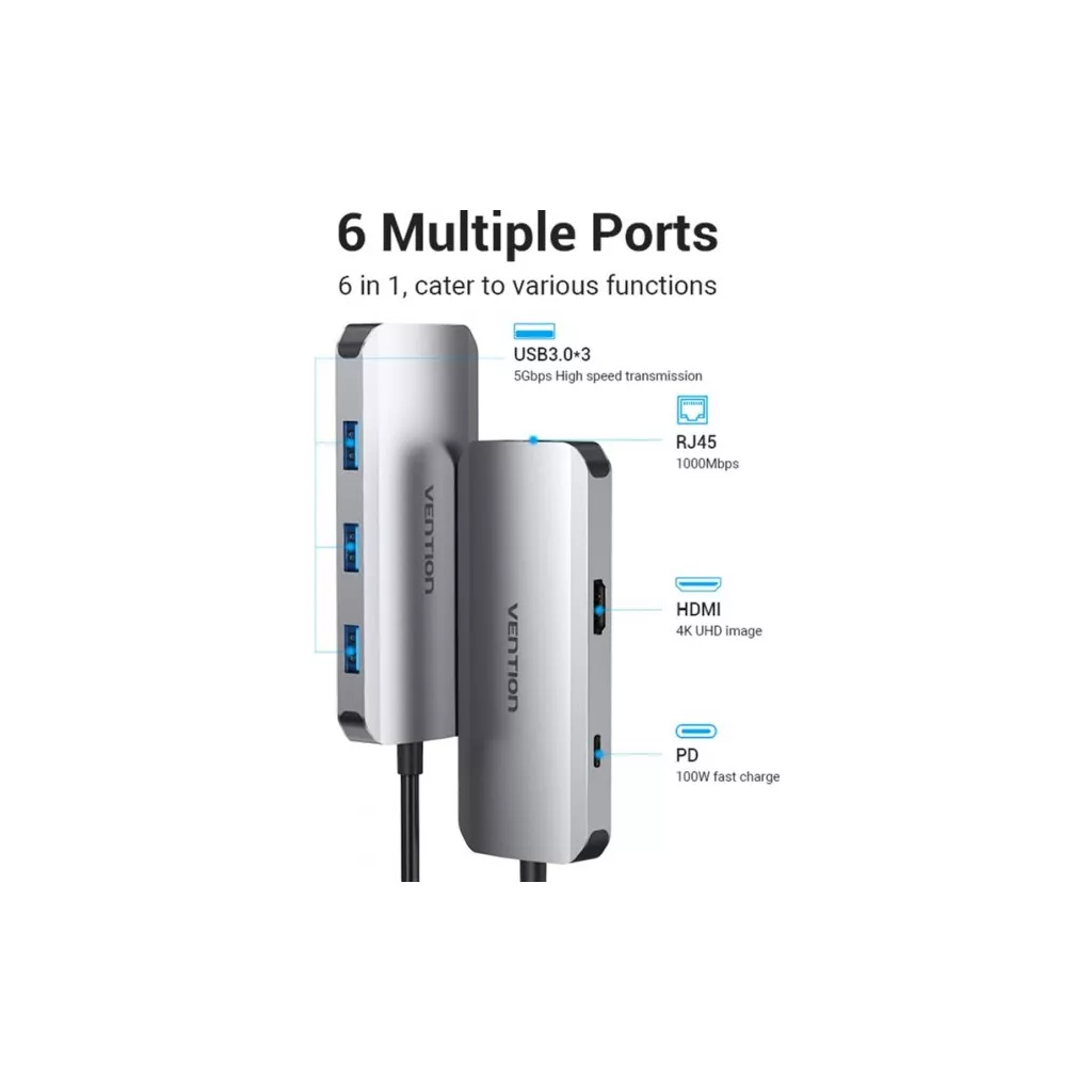 Мультифункциональная USB-C док-станция Vention TOHHB 6-in-1 обеспечивает подачу электроэнергии мощностью 100 Вт, поэтому является удачным решением для питания и подзарядки однопортового ноутбука. Она снабжена тремя портами USВ 3.0 со скоростью обмена данными 5 Гб/с, позволяющими одновременное подключение и бесперебойную работу трех USВ-приборов, таких как компьютерная мышь, клавиатура, принтер и т.д.