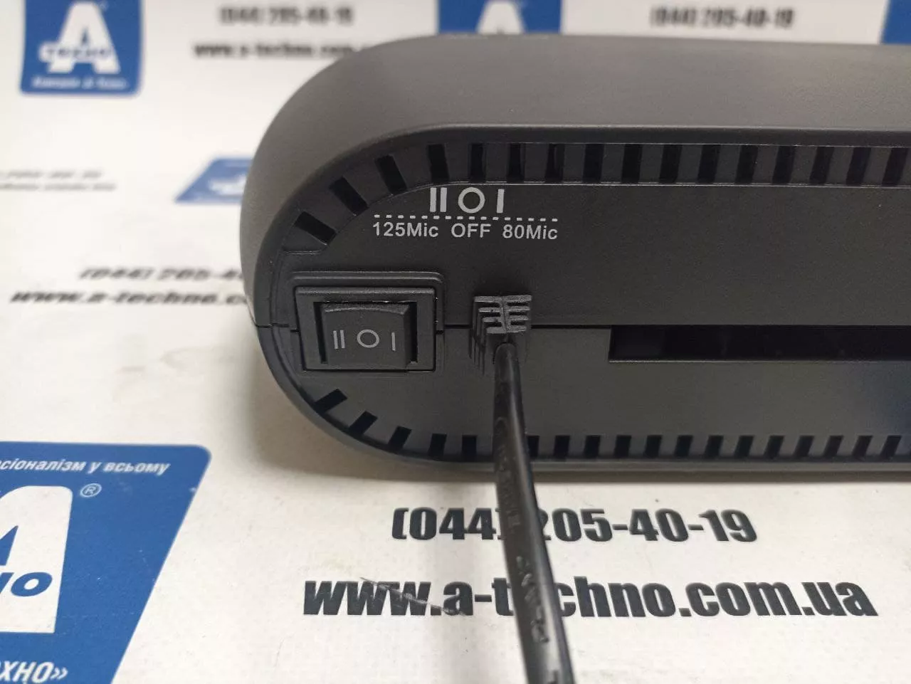 Формат до А4 (до 230мм), толщина пленки от 60 до 125мкм, скорость ламинирования 350мм/мин. Есть разжим валов.