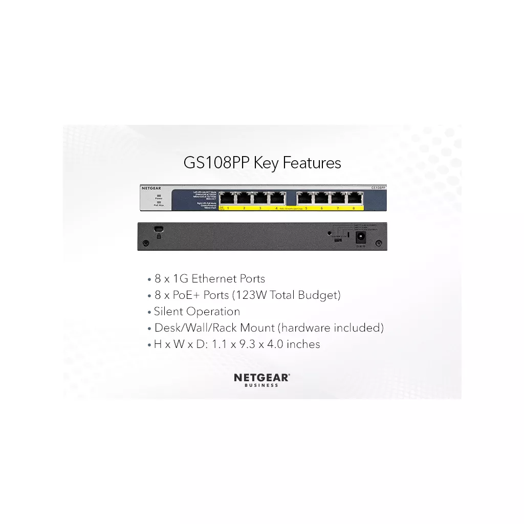 Неуправляемые коммутаторы NETGEAR серии GS1xxPP Gigabit Ethernet с поддержкой технологии PoE/PoE+ помогут создать простую, надежную и доступную сеть для дома PoE-устройств. С помощью этих легко подключенных и автоматически настраиваемых неуправляемых Plug-and-Play коммутаторов вы можете легко расширить свою сеть, мгновенно подключив несколько устройств.