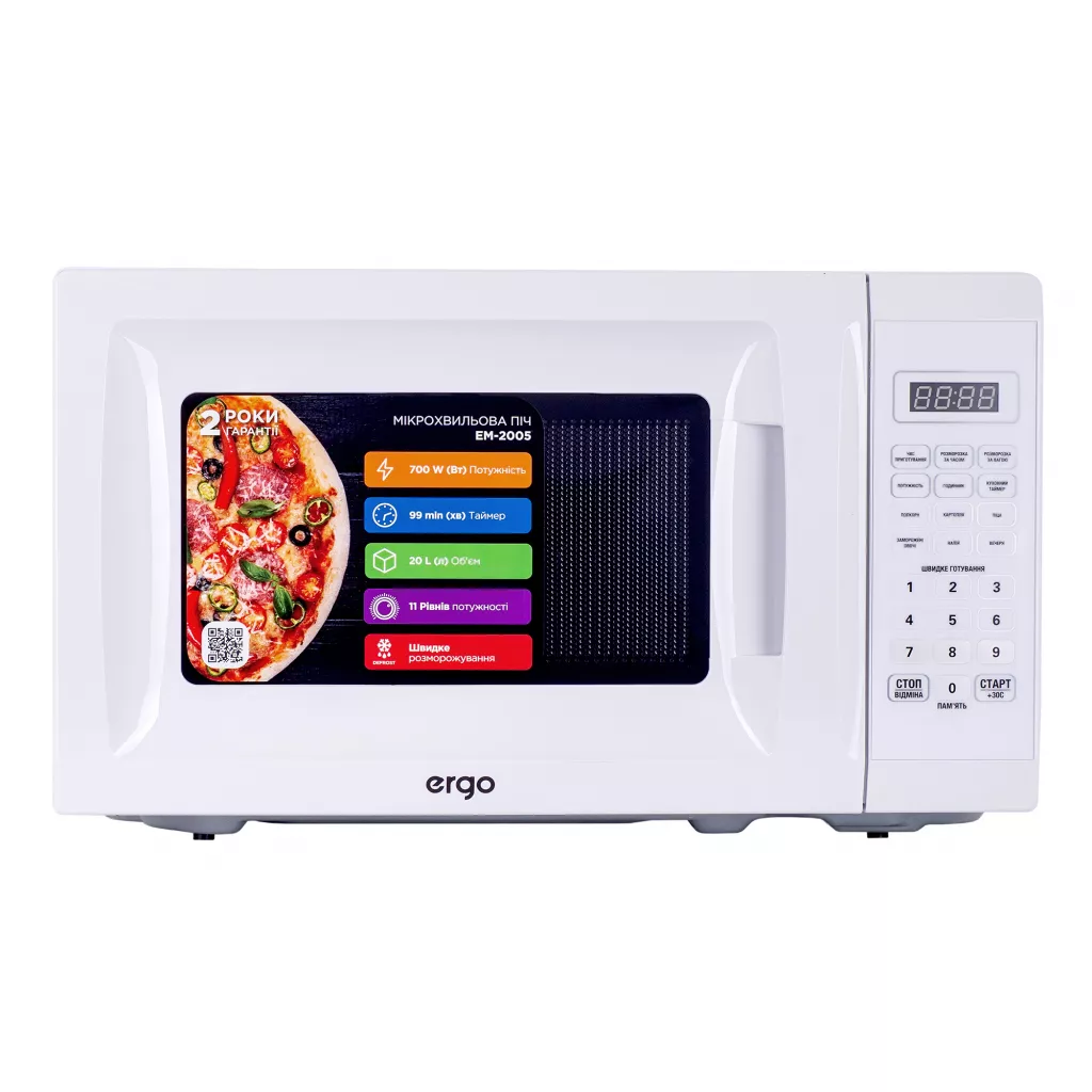 < b>ERGO EM-2005 — это микроволновка белого цвета с практичным дизайном. Пригодится для быстрого приготовления блюд и разогрева продуктов. Мощности в 700 Вт достаточно для точного контроля равномерного разогрева и размораживания. Микроволновая печь достаточно вместительна, ведь имеет объем 20 литров. Быстро разморозить мясо или другие продукты поможет функция автоматического размораживания. Поворотный стол обеспечивает равномерный разогрев пищи со всех сторон. Внутри печь покрыта эмалью, поэтому вы сможете легко очистить ее от загрязнений. Микроволновая печь ERGO EM-2005 станет незаменимым помощником на Вашей кухне.