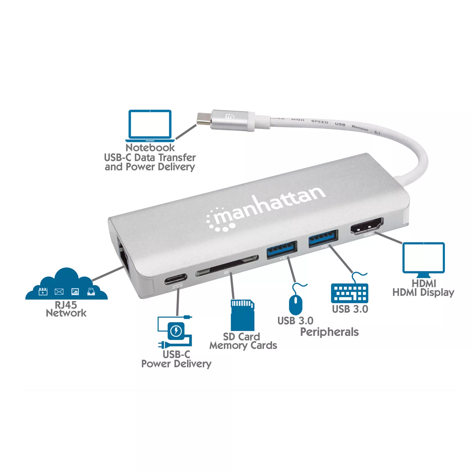 Подключение устройства USB Type-C к одному дисплею HDMI, двум устройствам USB 3.0 Type-A, доступ к сети Ethernet через один порт RJ45 10/100/1000 Мбит/с, достаточное питание для подключенных устройств через один порт USB- C Power Delivery ( PD) и одна карта памяти через одно устройство чтения карт SD.