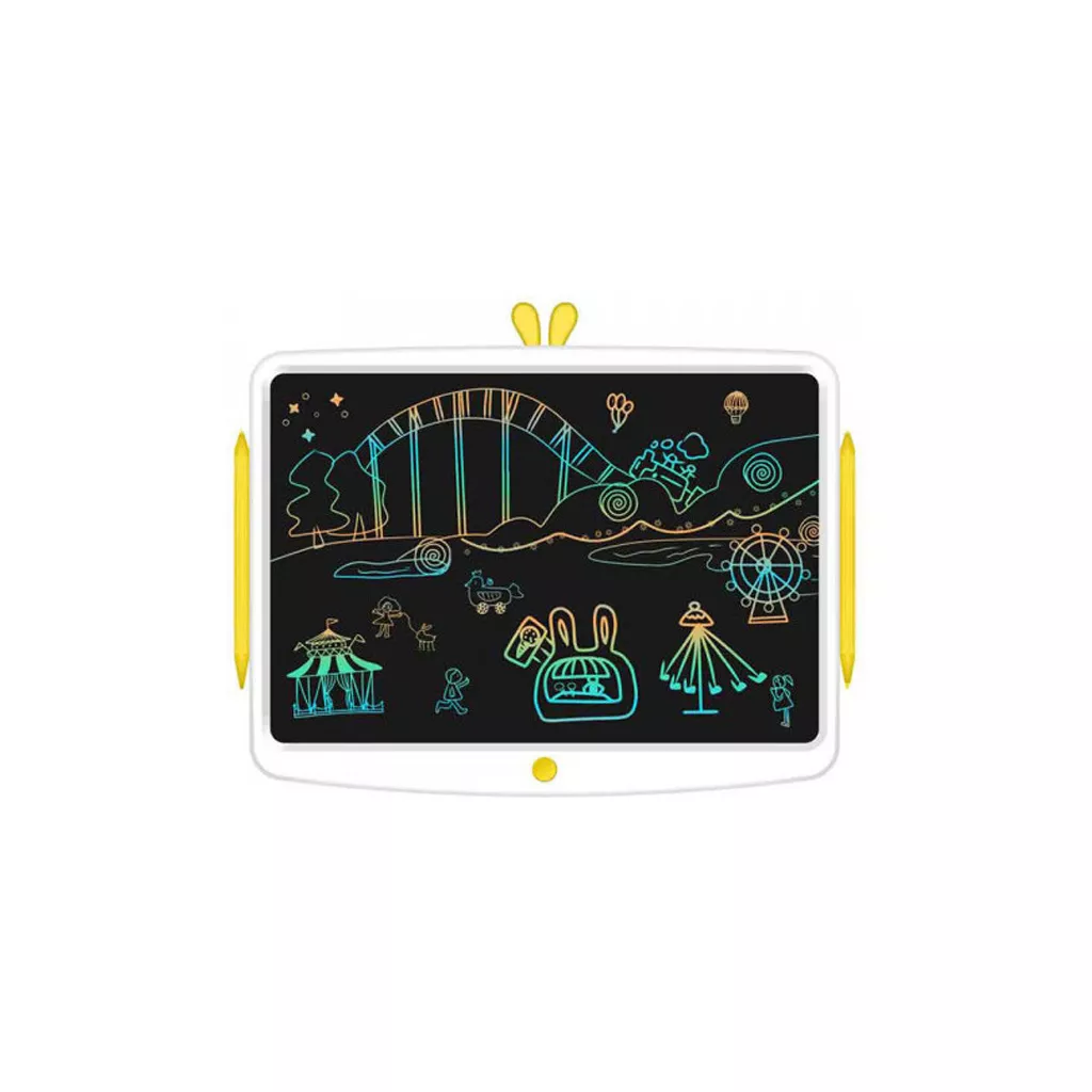Цветовой графический планшет Wicue Board LCD WNB416W с диагональю 16 дюймов, предназначен для детей от 3 лет и активных людей, любящих творчество. Планшет отличается компактными размерами 321 x 260 x 7 мм и легким весом, всего 397 г, поэтому пользователи могут поместить его в сумку, рюкзак и носить с собой. Симпатичный внешний вид< br> Изделие имеет привлекательный внешний вид с основными белыми тонами и двумя желтыми кроличьими ушками как яркие детали, создающие привлекательный внешний вид. Кроме того, края доски для рисования имеют мягкие закругления, чтобы обеспечить безопасность использования детьми.