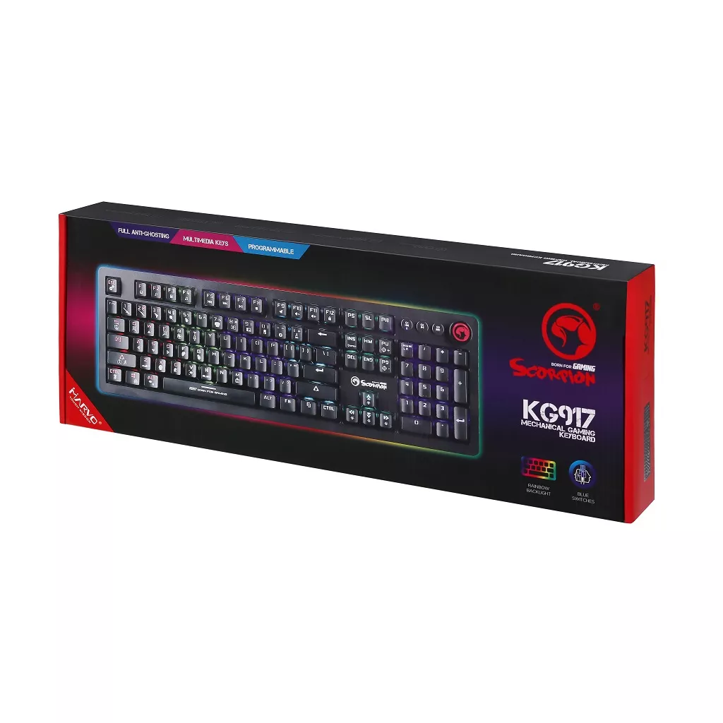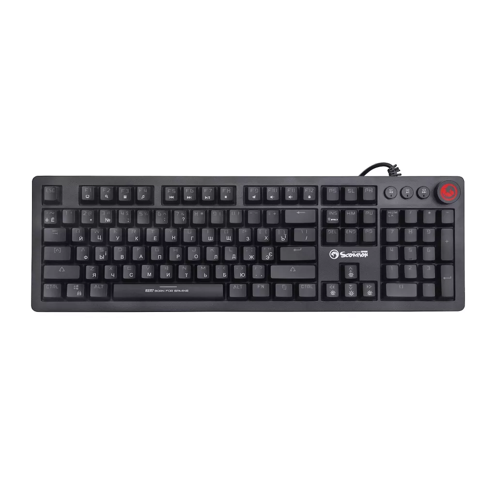 Игровая механическая клавиатура MARVO KG917 с синими свечами и динамической подсветкой. Устанавливай фирменное приложение и настрой клавиатуру под себя. Технология Full anti-ghosting: N-key rollover – точное распознавание нажатия клавиш. Вы можете нажать множество клавиш одновременно (плюс клавиши-модификаторы типа CTRL, ALT и т.д.), компьютер получит и обработает соответствующие сигналы от каждой из них. Установки подсветки под настроение, клавиатура имеет 20 схем динамических световых эффектов, переключайся между ними и любой оригинальной. Легко переключай аудио треки и настраивай громкость, благодаря отдельной мультимедийной панели. Изящный дизайн рамки;
